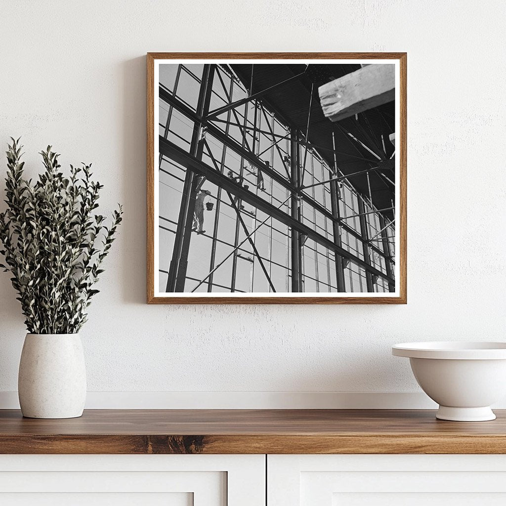 Los pintores trabajan a una altura considerable en el sitio de construcción de la planta Basic Magnesium Incorporated en el desierto del sur de Nevada. En 1942, los trabajadores operaban a setenta pies sobre el suelo, rodeados por una torre y montañas distantes. Este sitio jugó un papel crucial en la producción de magnesio, esencial para los esfuerzos militares durante la Segunda Guerra Mundial.