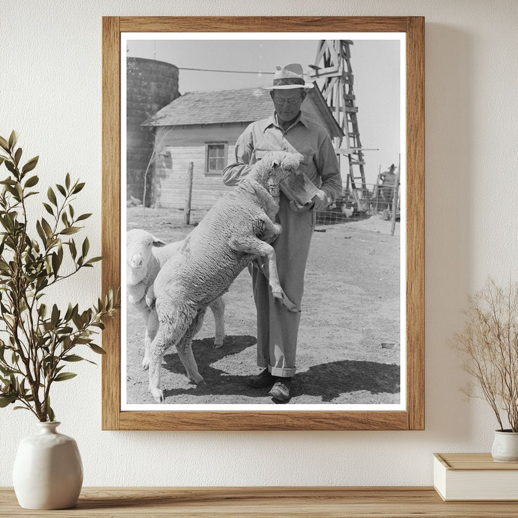 In August 1939, a Farm Security Administration client feeds sheep in Hoxie, Kansas. This image reflects agricultural practices in rural America during the late 1930s. The Farm Security Administration aimed to assist struggling farmers through various programs. Hoxie, established in 1879, is known for its rich agricultural history in the Midwest.