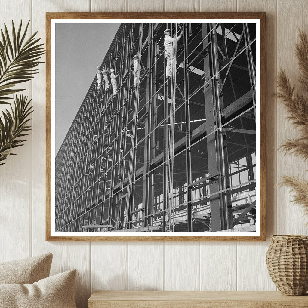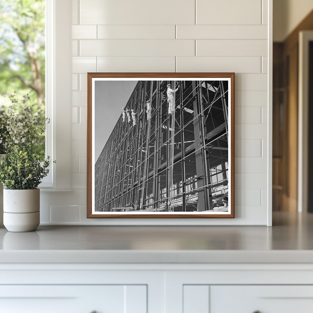 Los pintores trabajan a gran altura en la construcción de la planta de Basic Magnesium Incorporated en el sur de Nevada, probablemente cerca de Las Vegas. A principios de la década de 1940, esta instalación fue fundamental en la producción de magnesio para la Segunda Guerra Mundial. La imagen muestra las técnicas de construcción de la época y los proyectos industriales a gran escala que dieron forma al paisaje de Nevada.