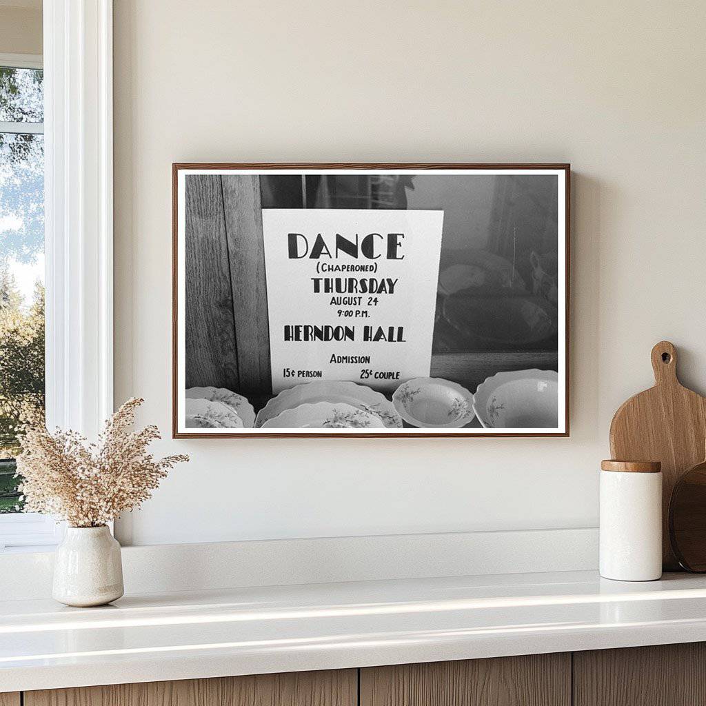 A drugstore window display in Syracuse, Kansas, appears in this vintage image from August 1939. The display features a prominently positioned poster that illustrates local commerce in a small town. Syracuse, located in the southwestern part of the state, served as a hub for community goods and services during that era. The photograph is part of the FSA/OWI Collection.