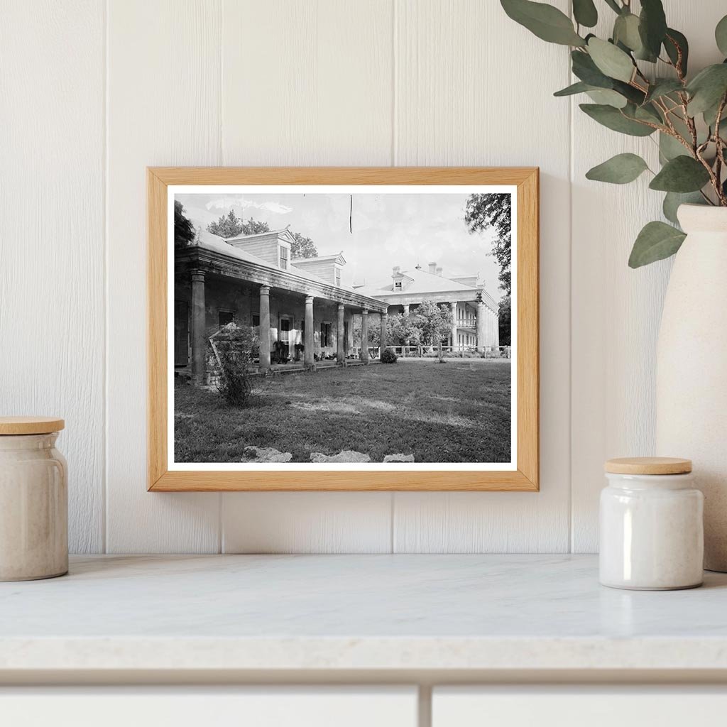 This vintage photograph captures a historical architectural ensemble located in Convent, St. James Parish, Louisiana. The main building, dating back to 1836, features two stories and is surrounded by 28 Doric columns. Accompanying structures include two garconnieres and two smaller cottages, each with octagonal towers, contributing to the unique architectural landscape.