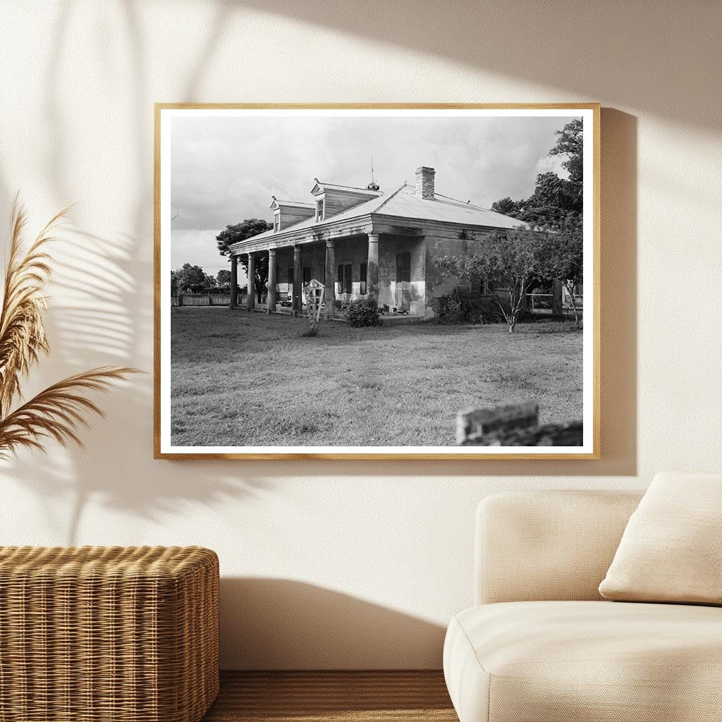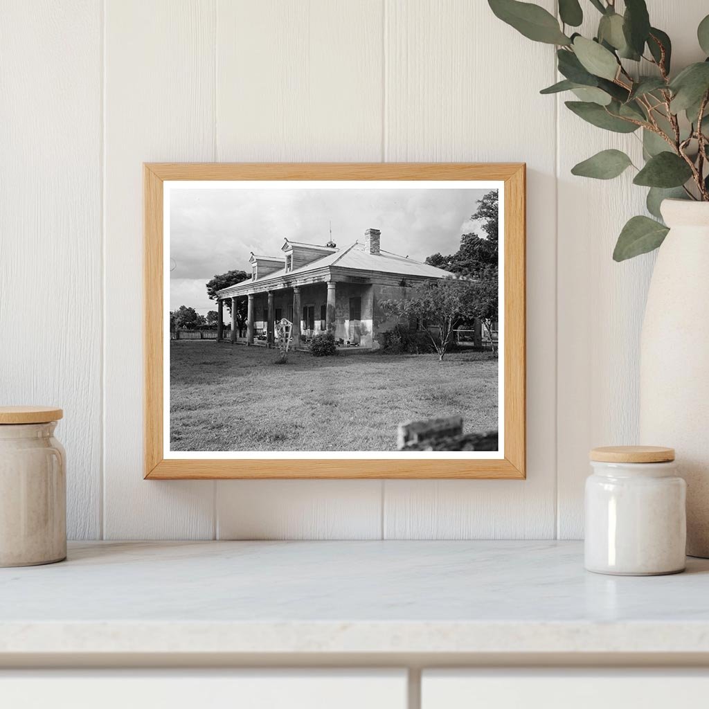 This vintage photograph showcases a historical architectural group located in St. James Parish, Louisiana, near Convent. The main building, constructed in 1836, features two stories and is elegantly surrounded by 28 Doric columns. The composition includes two garconnieres, smaller cottages, and pigeonnieres, each topped with distinctive octagonal towers.