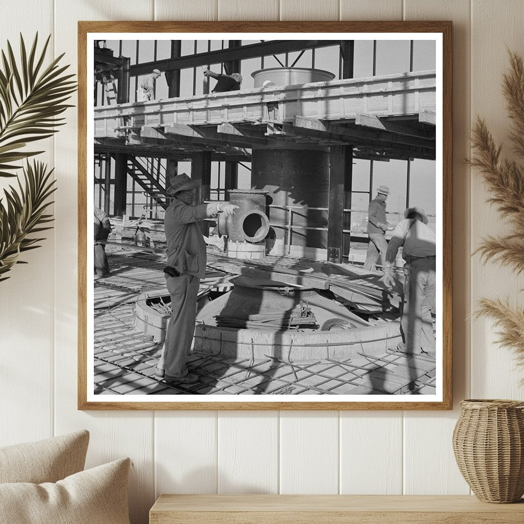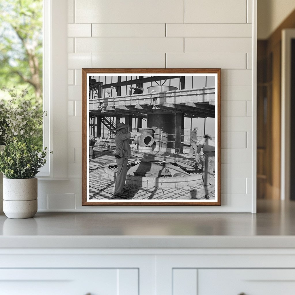 The vintage image features a construction scene at the Basic Magnesium Incorporated plant in Las Vegas, Nevada. In the early 1940s, workers engaged in steel structure assembly and carpentry contributed to the war effort by producing magnesium, essential for aircraft production. The plant played a crucial role in the United States’ wartime industry.