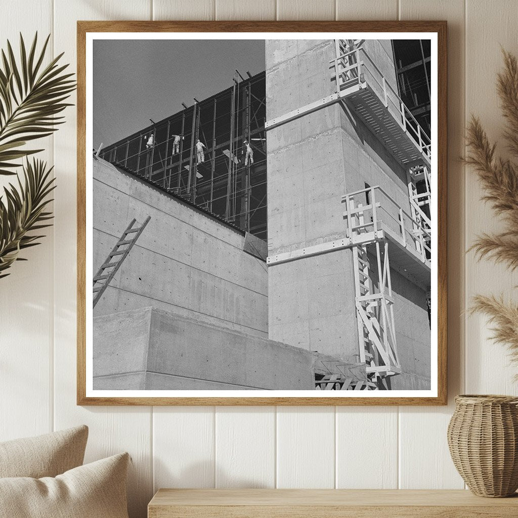 Painters work at a significant height, approximately seventy feet above ground, on the construction site of the Basic Magnesium Incorporated plant in Las Vegas, Nevada, in 1942. This site played a crucial role in World War II, providing magnesium for wartime materials. The image documents early 20th-century industrial labor in a challenging environment.