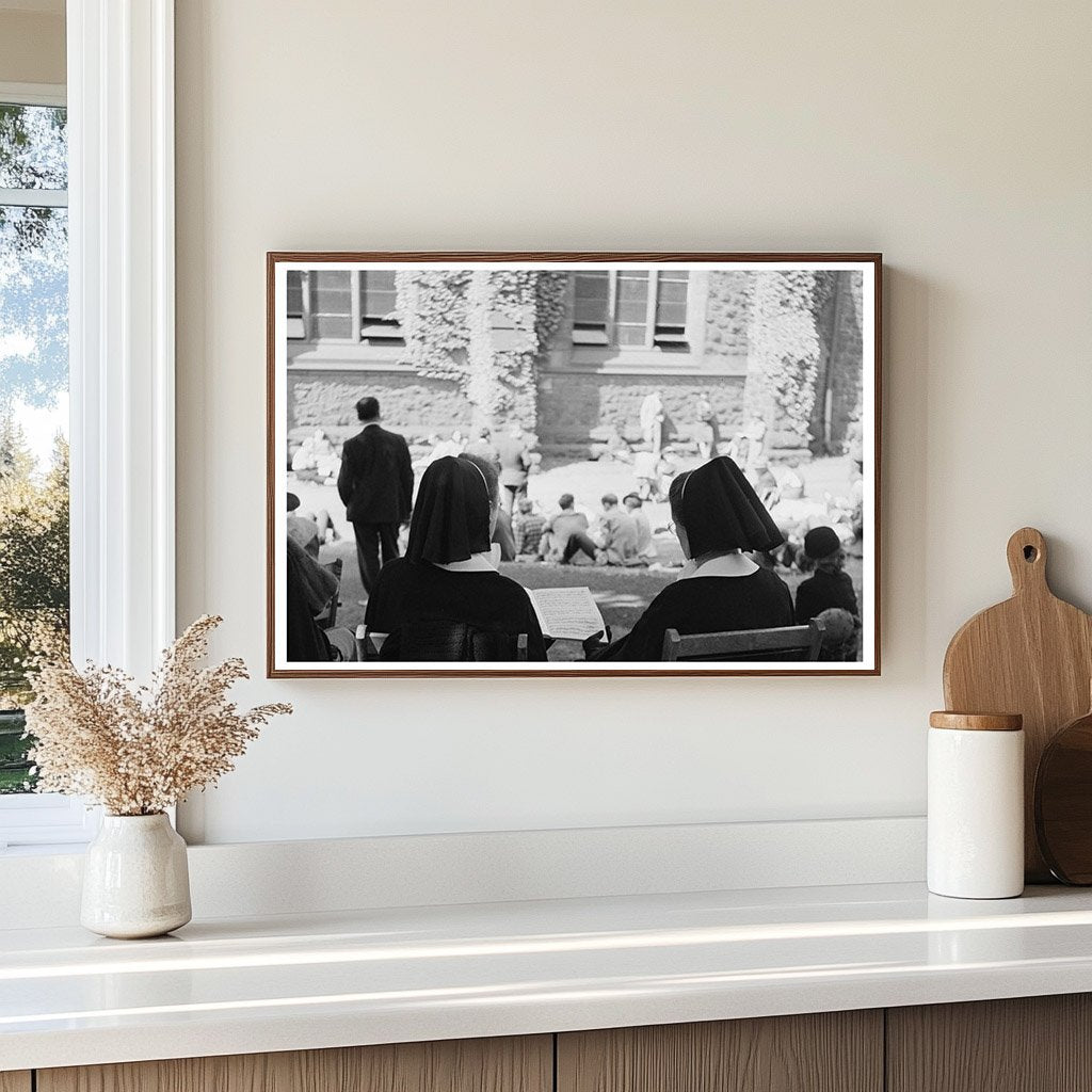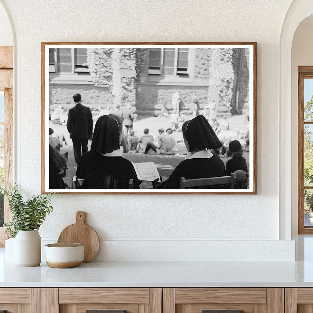 Attendees gather on the lawn outside a chapel during the Bach Festival in Bethlehem, Pennsylvania, in May 1944. This event celebrated the works of composer Johann Sebastian Bach and highlighted the communitys appreciation for classical music. The annual festival grew to become a notable cultural gathering in the region.