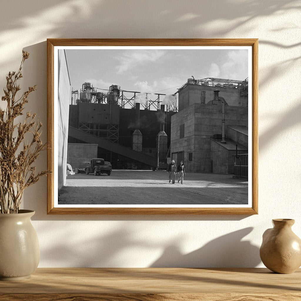 Las Vegas, Nevada, features the Basic Magnesium Incorporated plant, which operated during World War II. In 1943, the facility played a critical role in producing magnesium, an essential metal for aircraft and wartime manufacturing. The image shows two workmen in the foreground, emphasizing the labor involved in this vital industry.
