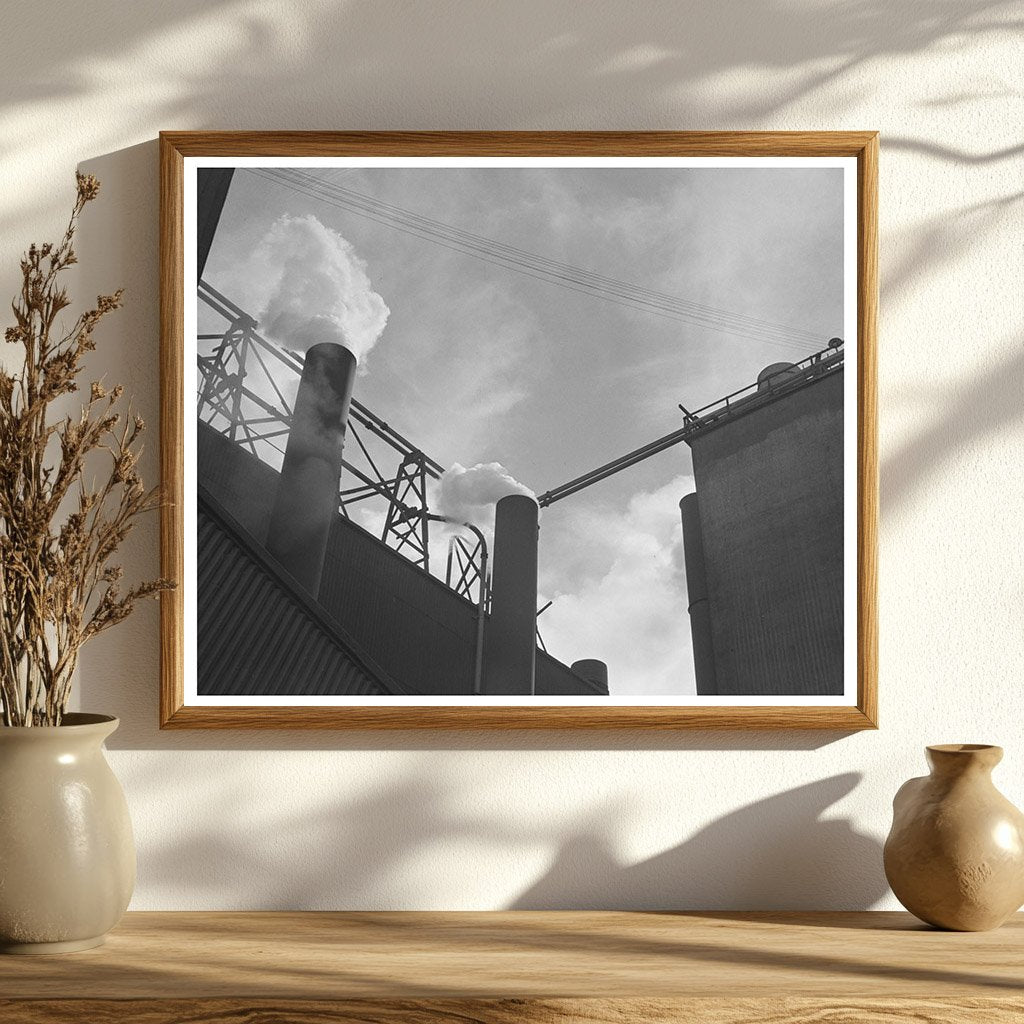 Smoke emanates from the stacks of the Basic Magnesium Incorporated plant in Las Vegas, Nevada. Constructed during World War II, the facility produced magnesium, essential for aircraft and munitions. Its operations significantly contributed to the war effort. This image captures a pivotal moment in industrial history from the 1940s.