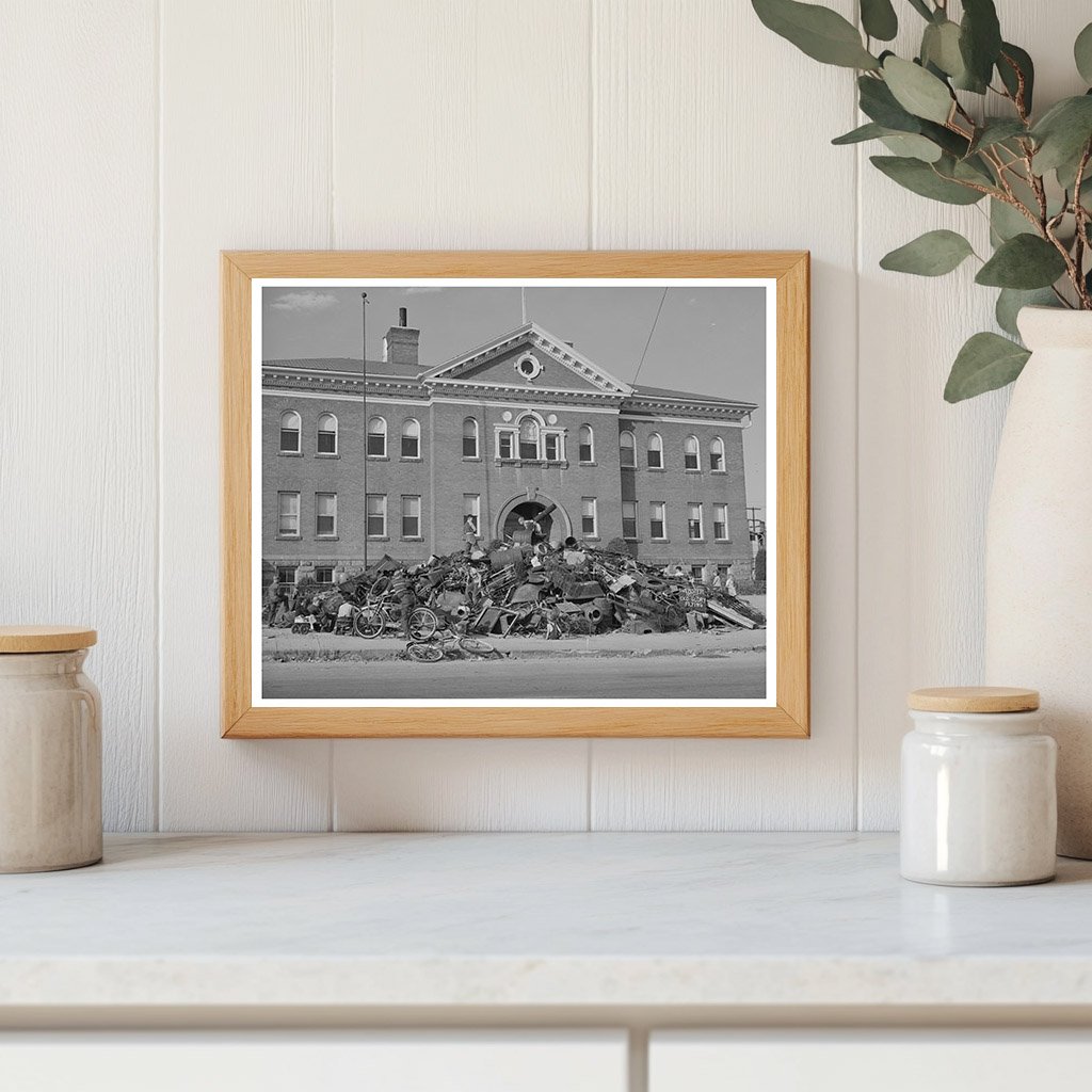 In October 1942, a pile of scrap materials is gathered in front of a school in Butte, Montana. This image captures a salvage campaign that took place during World War II. The initiative aimed to collect resources in Silver Bow County to support the war effort, highlighting community involvement in recycling efforts.