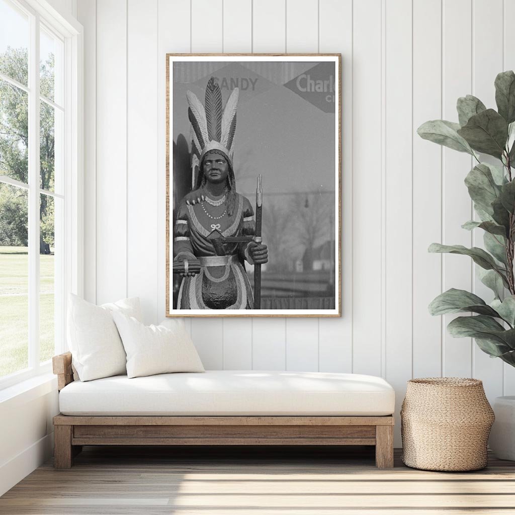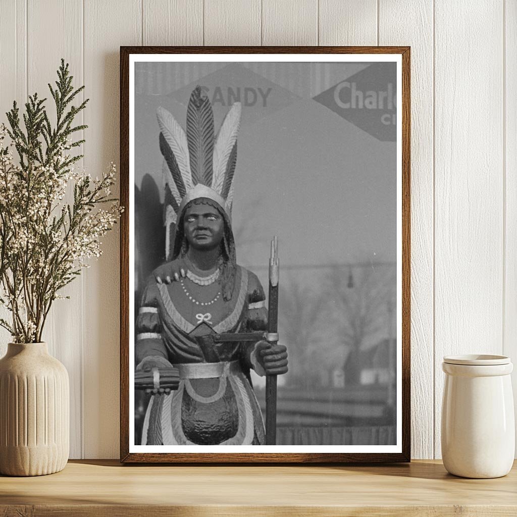 A Cigar Store Indian stands prominently in Denison, Iowa, in December 1936. These wooden figures served as iconic symbols for cigar shops, attracting customers with their unique craftsmanship. Originating in the 19th century, Cigar Store Indians were a prevalent marketing tool across the United States, representing a blend of art and commerce.