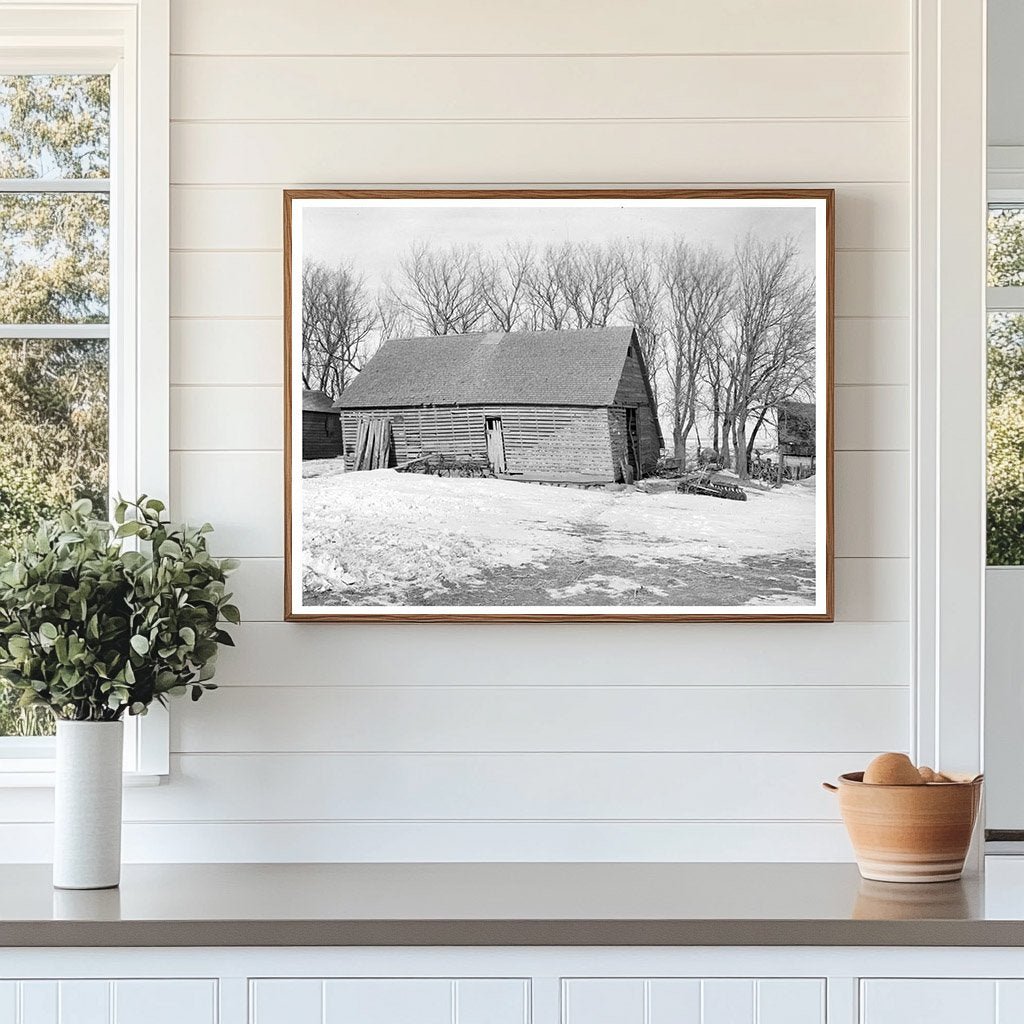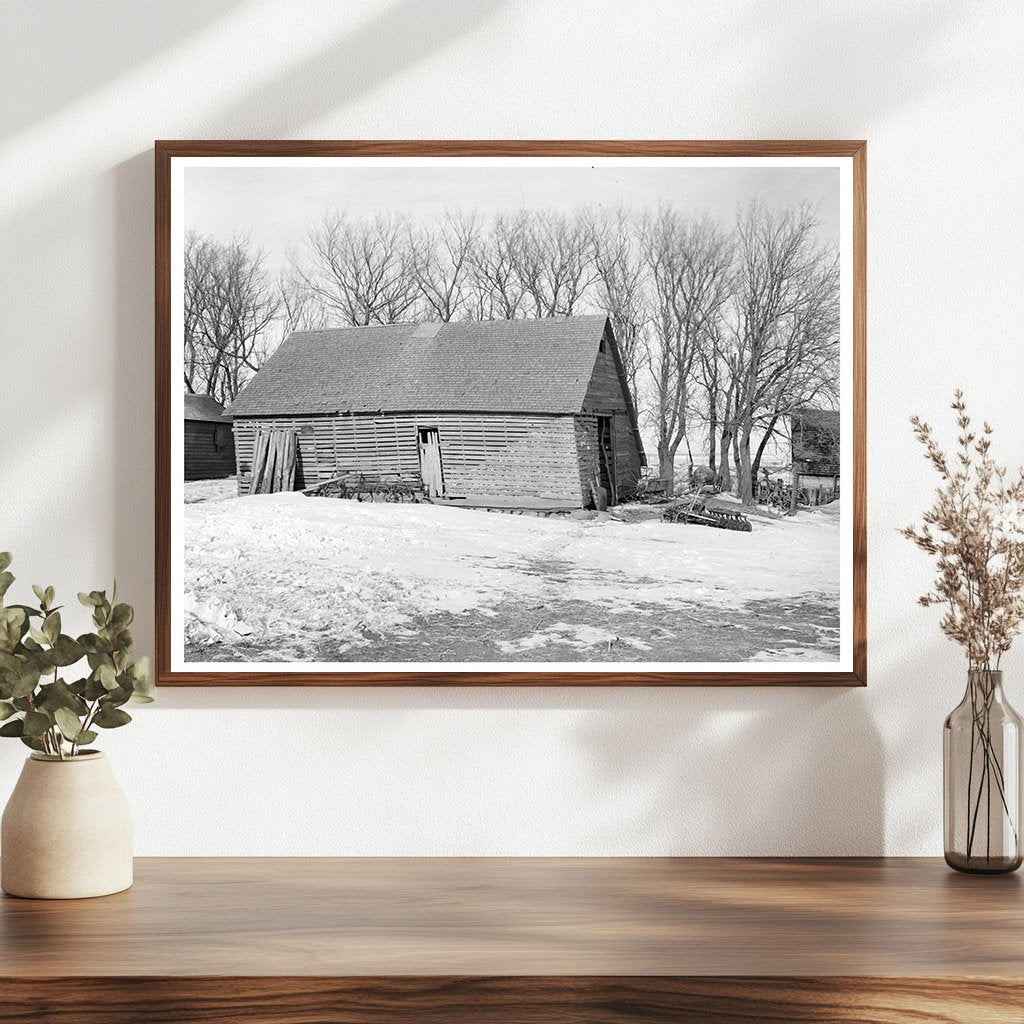 A corn crib stands on Edgar Allens farm near Milford, Iowa, in December 1936. The farm spans 160 acres and utilizes a crop share lease system. Corn cribs were essential for storing harvested corn, vital to livestock feed and cash crops. This image is part of the FSA/OWI Collection, which documents agricultural life during the Great Depression.