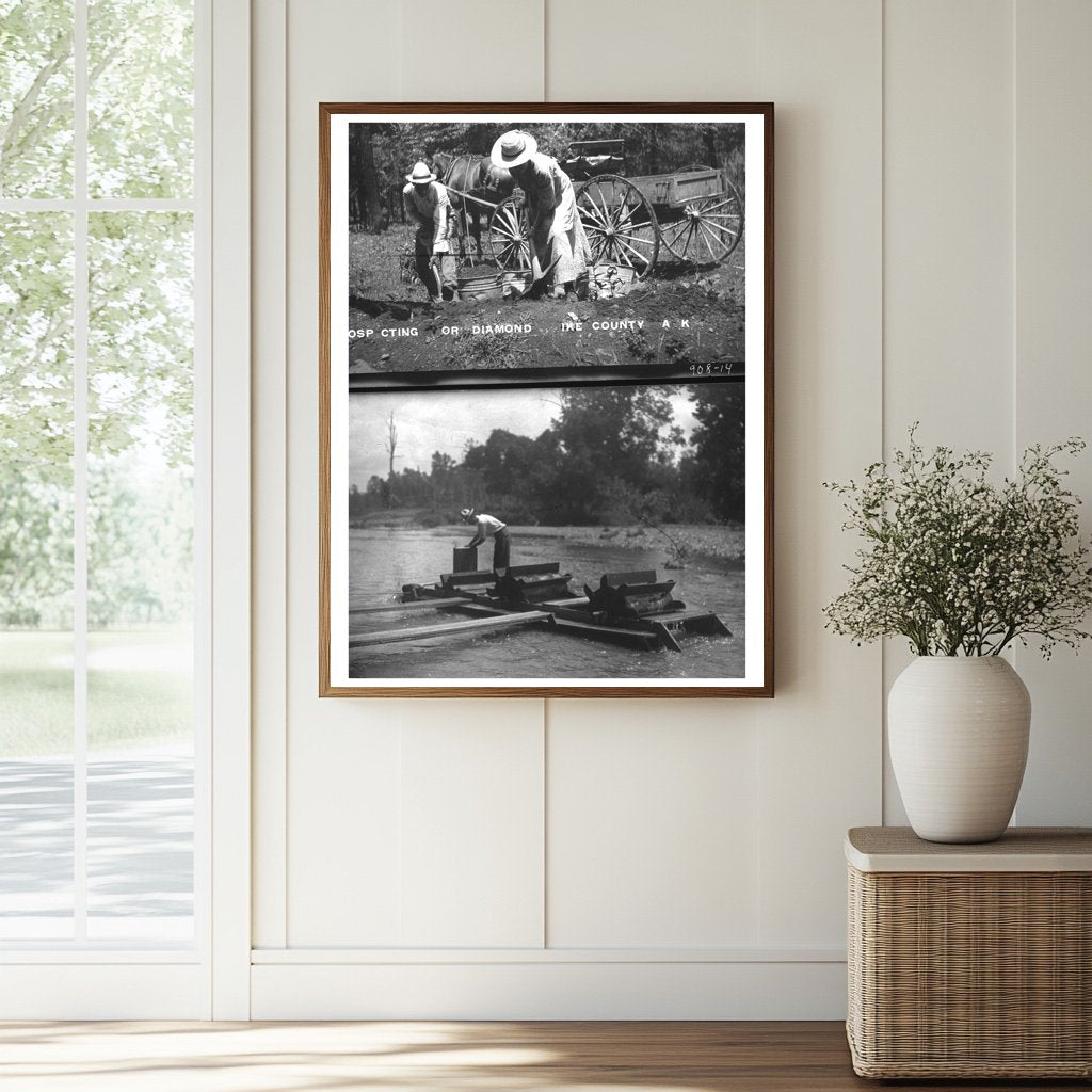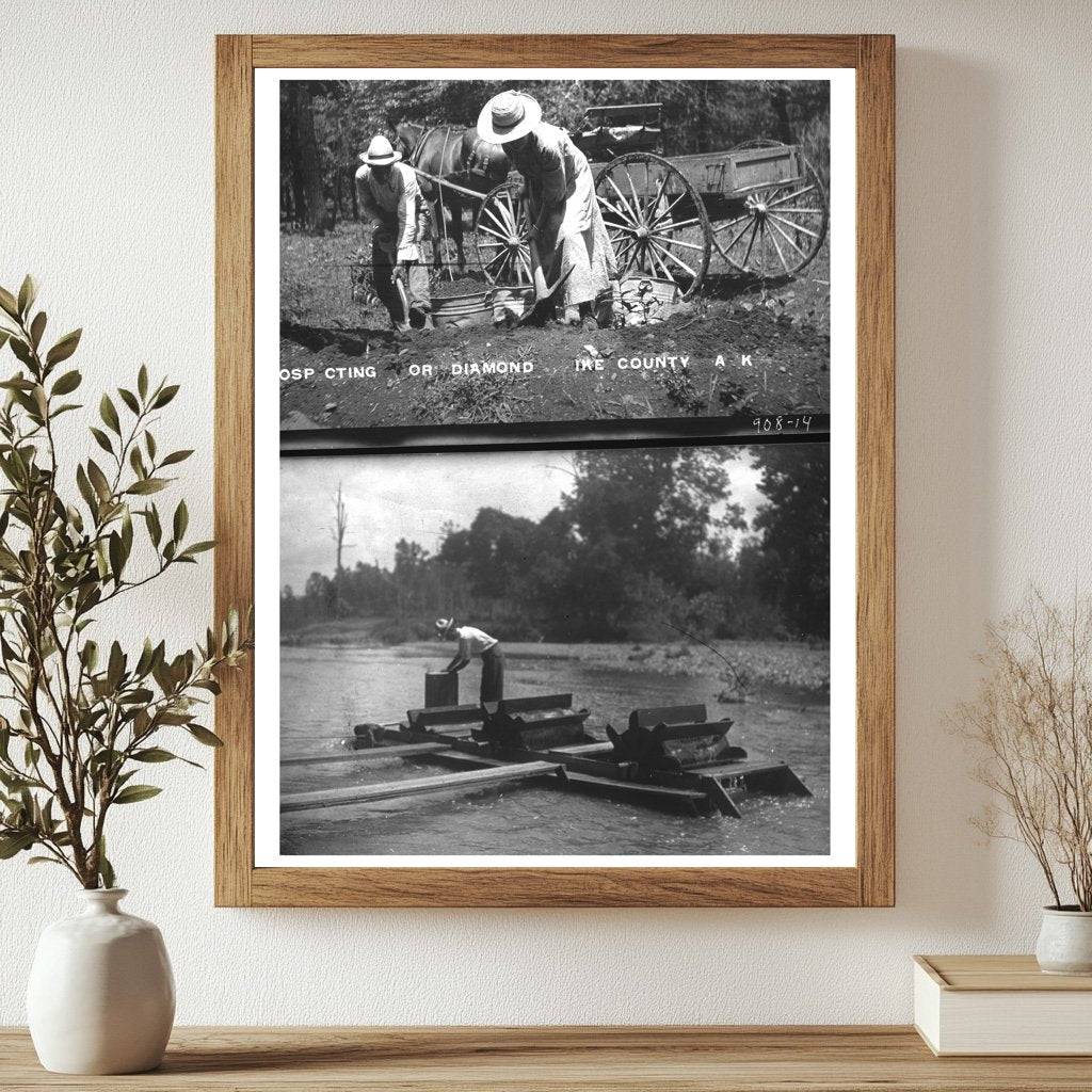 During the late 19th and early 20th centuries, the discovery of diamonds in Arkansas attracted prospectors and adventurers, sparking a small-scale diamond rush. This photograph serves as a visual documentation of those efforts, showcasing how individuals engaged in this unique form of mining. The glass negative format provides a clear snapshot of the environment and techniques employed, reflecting not only the work involved but also the hope and ambition that drove many to seek their fortune in the diamond fields of Arkansas.