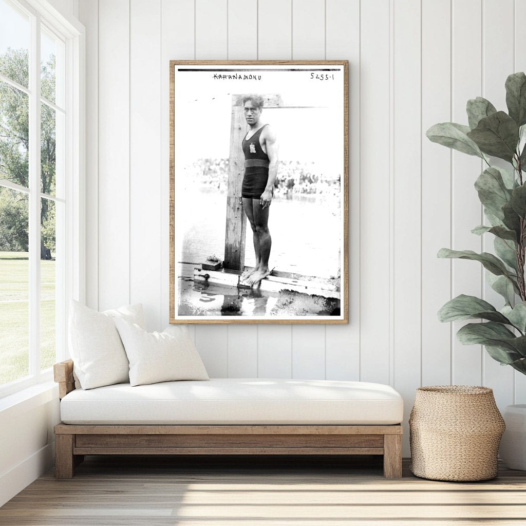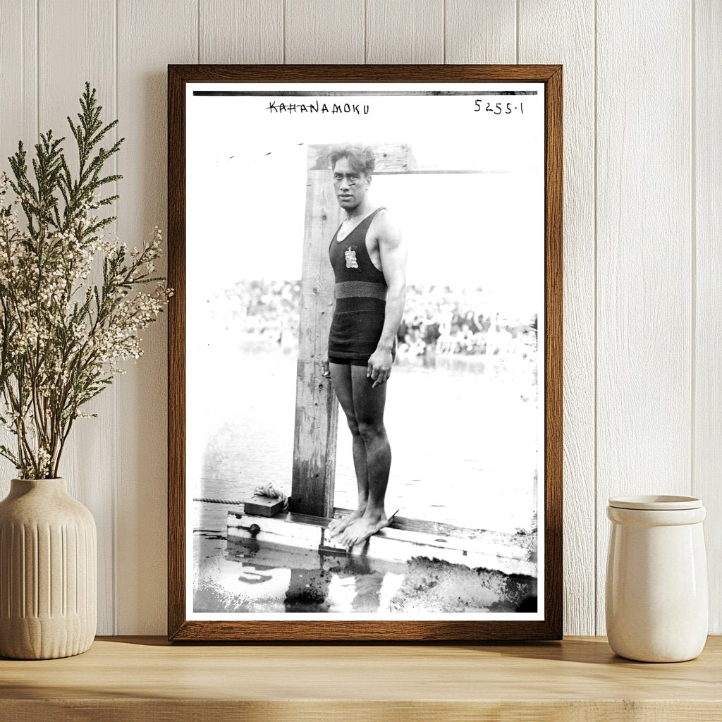 During this period, Kahanamoku had already made waves in the swimming world, winning multiple Olympic medals. His legacy includes not only his athletic prowess but also his efforts in popularizing surfing as a thrilling and respected pastime. This image serves as a reminder of the deep roots of Hawaiian culture and the growing interest in water sports that swept across the globe in the early 20th century. Kahanamokus sunny persona and dedication to his craft left an indelible mark on both sports and cultural exchange, influencing generations to come.