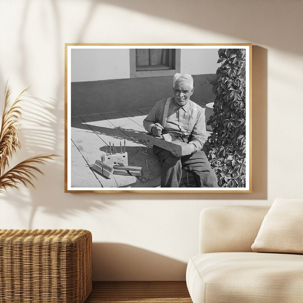 An elderly Spanish-American farmer stands in Chamisal, New Mexico, surrounded by homemade agricultural tools. This image captures rural life in Taos County during July 1940. The farmers tools reflect traditional farming practices and the self-sufficiency of the community, showcasing the agricultural heritage of the region.