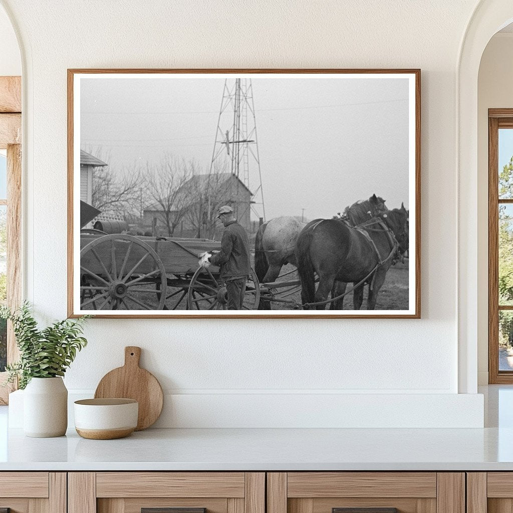 In Fowler, Indiana, a farmer named Tip Estes prepares his horses for work at 6:15 a.m. in March 1937. This image showcases the significance of horses in early 20th-century agriculture. The oat seeder represents the farming techniques employed during that time, highlighting the daily routines of rural life and farm operations in Indiana.