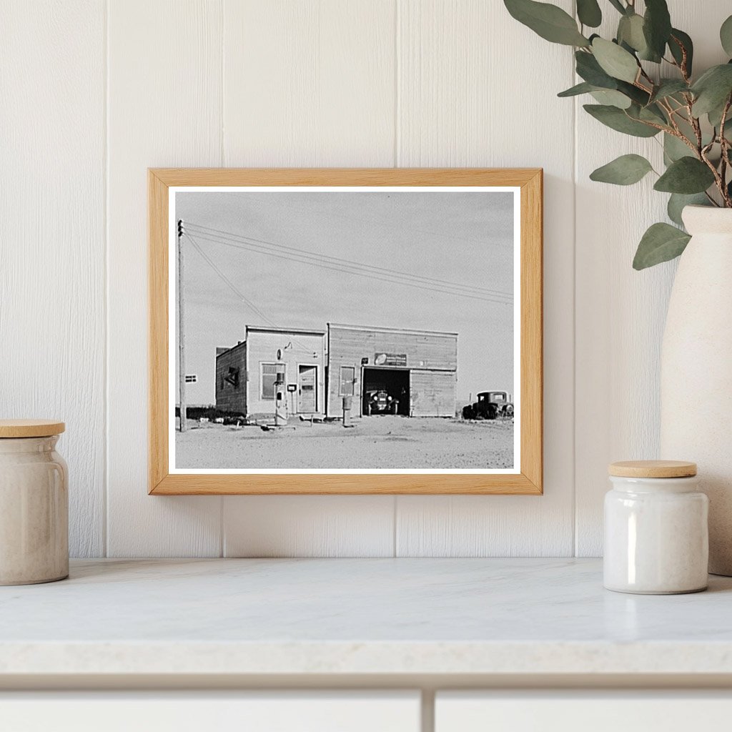 A rural garage structure stands in Rawson, McKenzie County, North Dakota. Captured in November 1937, this vintage image showcases the architectural style common to small towns in the region. It is part of the FSA/OWI Collection, preserving the historical landscape and building design of North Dakota during this era.