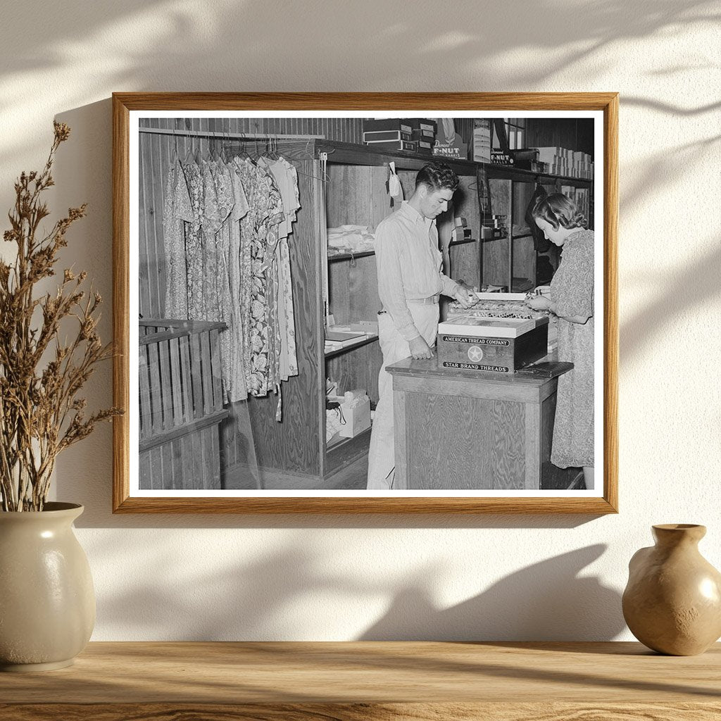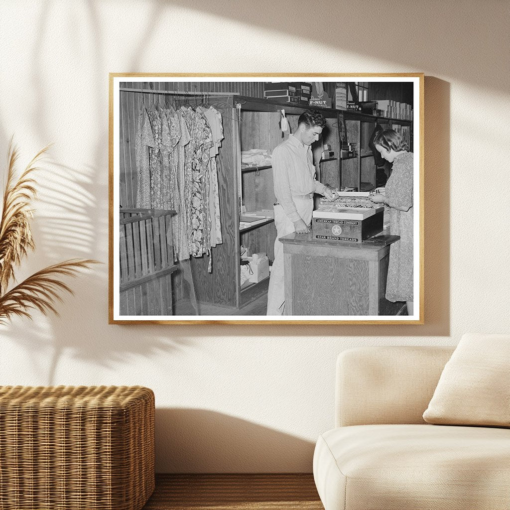 Step back to October 1938 at a cooperative general store in Lake Dick Project, Arkansas. This vintage image showcases a dress and dry goods counter reflecting the local economy of that time. The scene offers insights into the community life and commerce of Jefferson County, Arkansas, during the late 1930s.