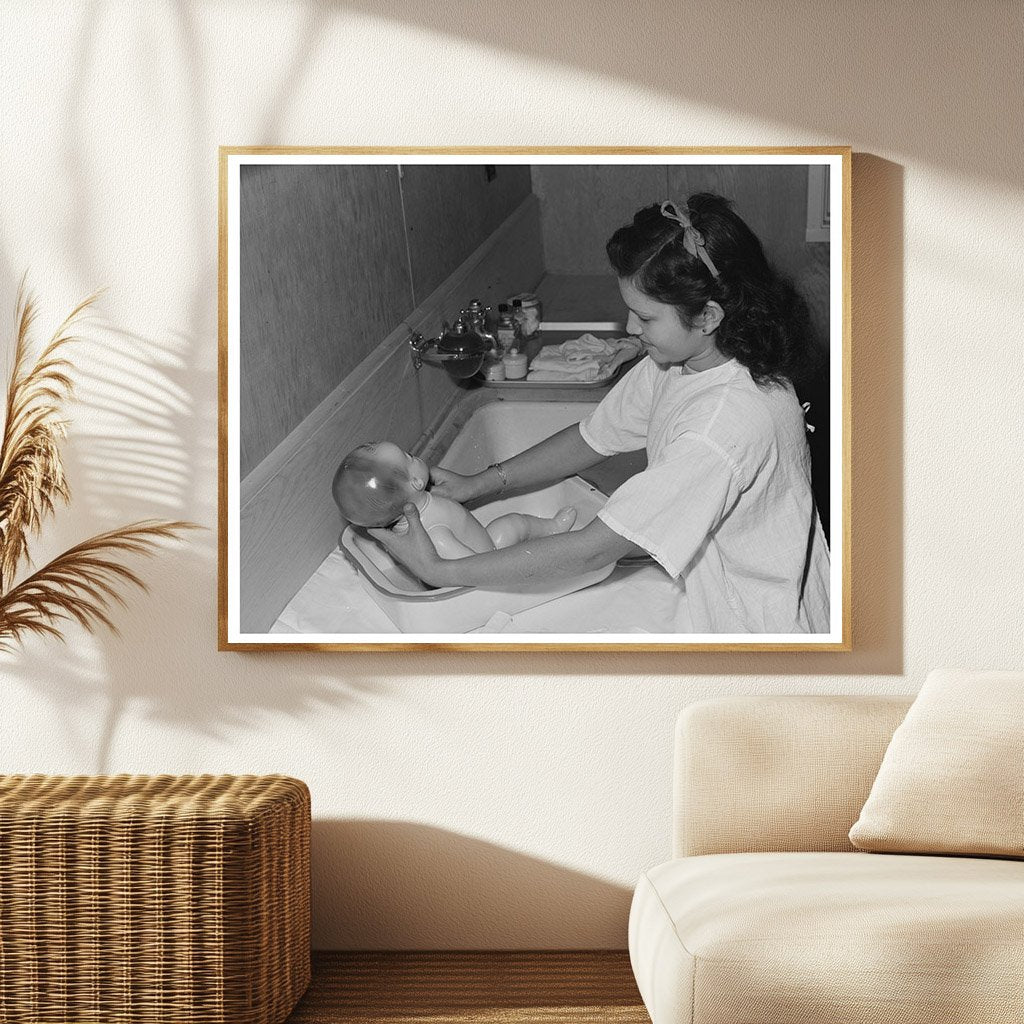 A young girl learns to bathe an infant at the National Youth Administration resident center in Eleven Mile Corner, Arizona. Taken in January 1942, this image reflects daily life in a farm workers community in Pinal County. The NYA provided support and education to youth during challenging times in American history.