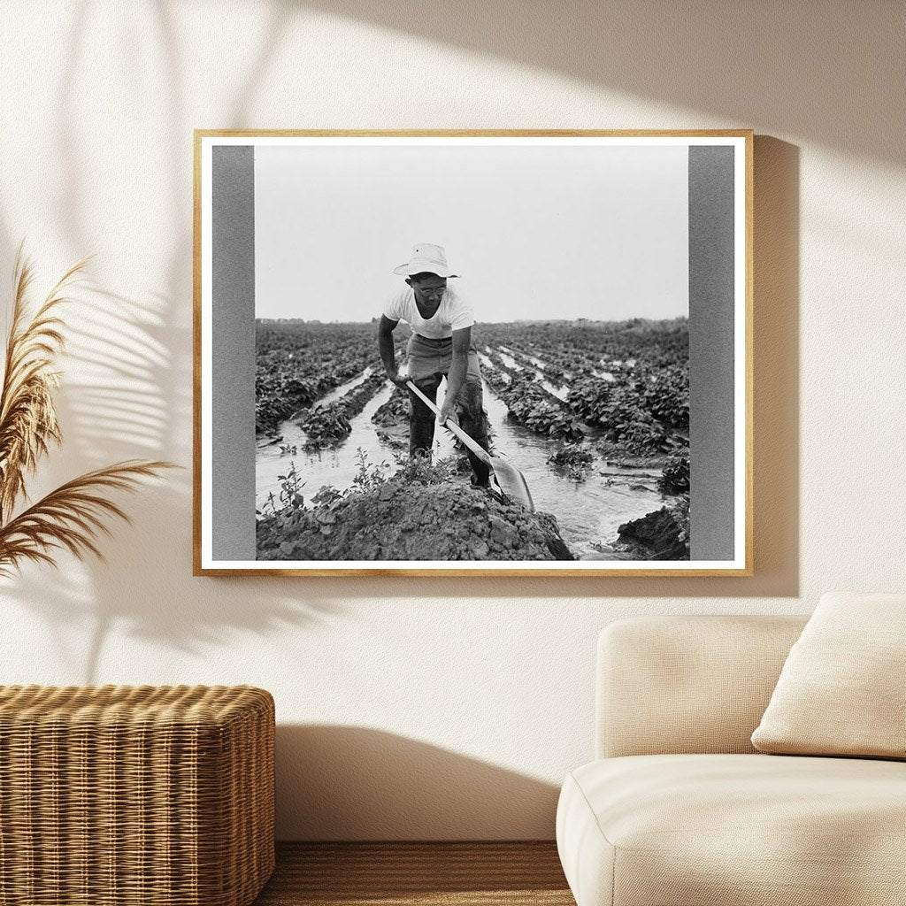 This vintage image showcases a Japanese-American farm worker at a Civilian Conservation Corps camp in Rupert, Idaho. Captured in July 1942, the camp was managed by the Farm Security Administration. It is situated in Minidoka County, known for its agricultural significance during the era of Japanese-American internment.