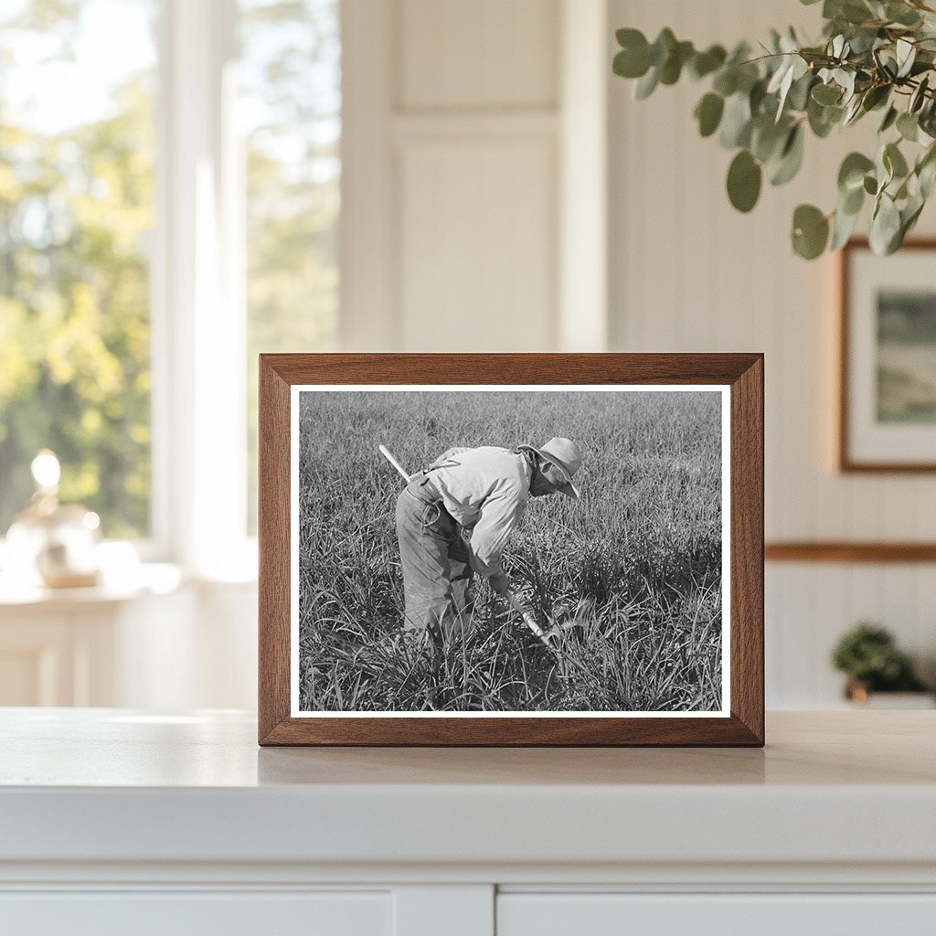 A Japanese-American worker weeds onions in Twin Falls County Idaho in August 1942. This vintage image captures agricultural labor during World War II. It showcases the contributions of Japanese-Americans to farming in the U.S. and is part of the FSA/OWI Collection, highlighting diverse communities in American agriculture.
