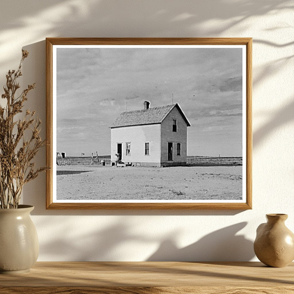 This vintage image showcases the home of farmer John Baker in Crosby, Divide County, North Dakota. Taken in October 1937, it captures the rural landscape and housing typical of drought-affected areas. The photograph is part of the FSA/OWI Collection, representing agricultural life during a challenging period in American history.