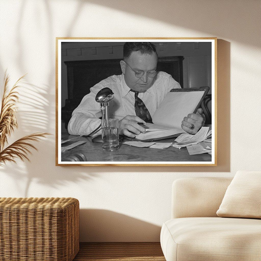 In October 1942, John McCloud served as the recording secretary of the Butte miners union in Butte, Montana, a key site in Silver Bow County. The image offers insight into labor organization during a critical period in U.S. labor history. This vintage photograph captures the essence of union activities and local labor dynamics.