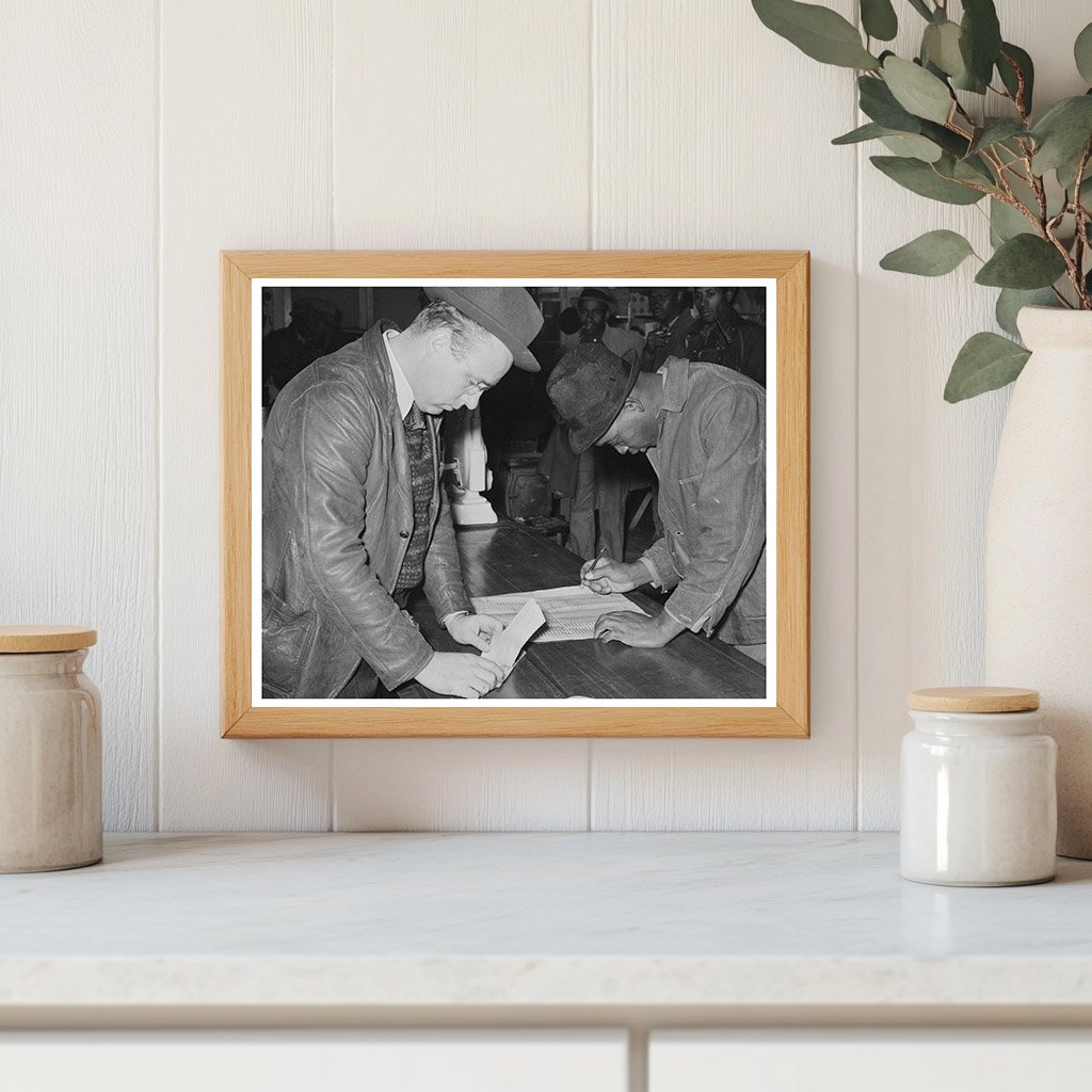 A member of the Lakeview Cooperative Association in Arkansas receives a check from the paymaster. This image from December 1938 captures a significant moment of economic activity in Phillips County. The Lakeview Cooperative Association played a vital role in fostering community involvement and promoting cooperative efforts among local residents.