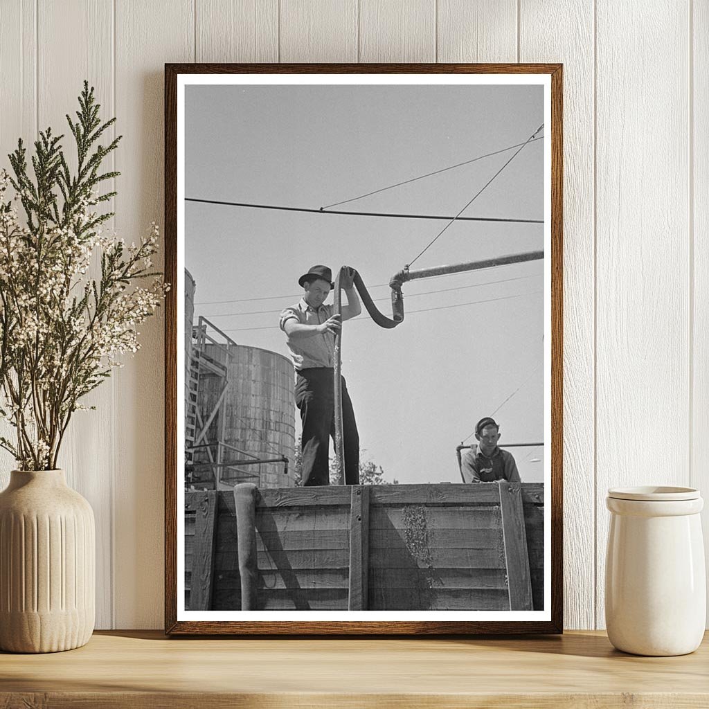Liquid feed loading occurs at a station in Owensboro, Kentucky, in May 1938. The image illustrates the agricultural practices of the time, showcasing how farmers utilized liquid feed to sustain livestock. This method played a crucial role in the farming economy of Kentucky during the late 1930s, as documented by the FSA/OWI Collection.