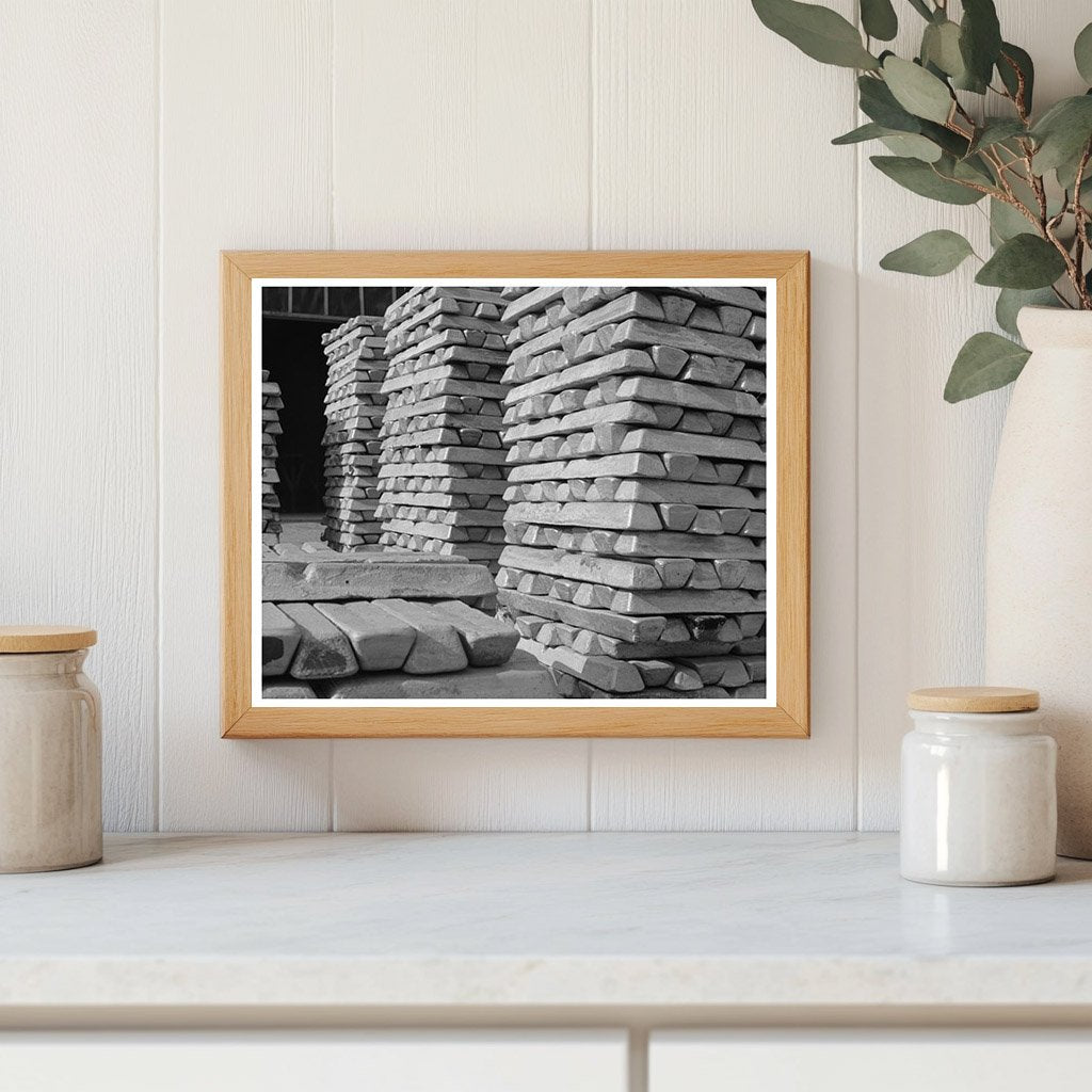 Stacks of magnesium ingots fill a manufacturing facility in Las Vegas, Nevada. Produced by Basic Magnesium Incorporated, these ingots served critical roles in World War II, specifically for aircraft production and tracer bullets. The image dates from 1942, highlighting the significant industrial efforts supporting the war.