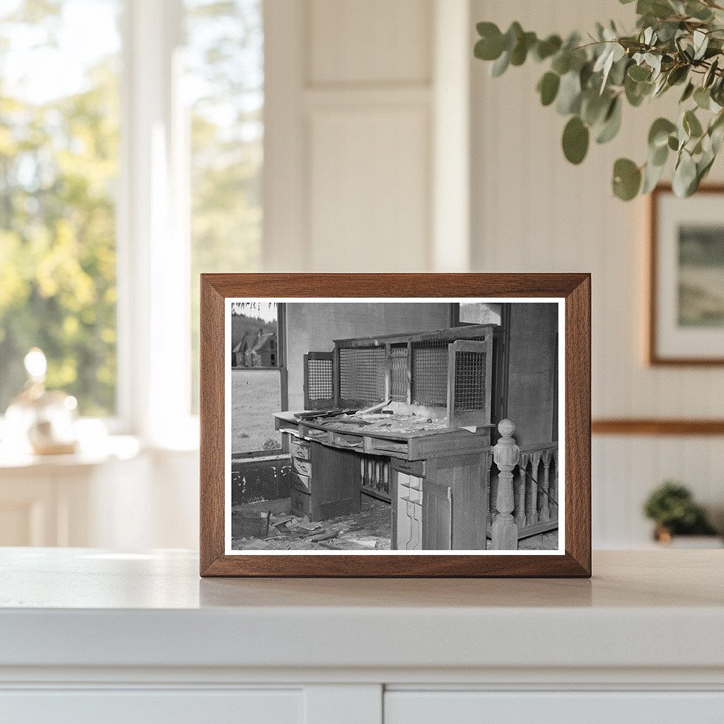 This vintage image captures the counter of the main mining office in Two Bit Creek, South Dakota. Taken in November 1937, it reflects the gold mining industry in Lawrence County. The photograph showcases the environment where miners and officials conducted daily business, providing insight into the operational aspects of mining during that era.