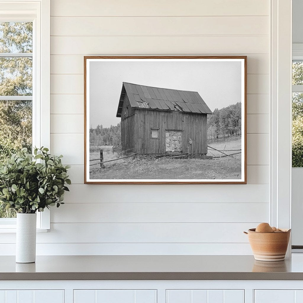 This vintage image features an old barn in a ghost mining town near Deadwood, South Dakota. Taken in November 1937, it represents the historical context of gold mining towns in Lawrence County. The photograph is part of the FSA/OWI Collection and showcases a significant era in American history.