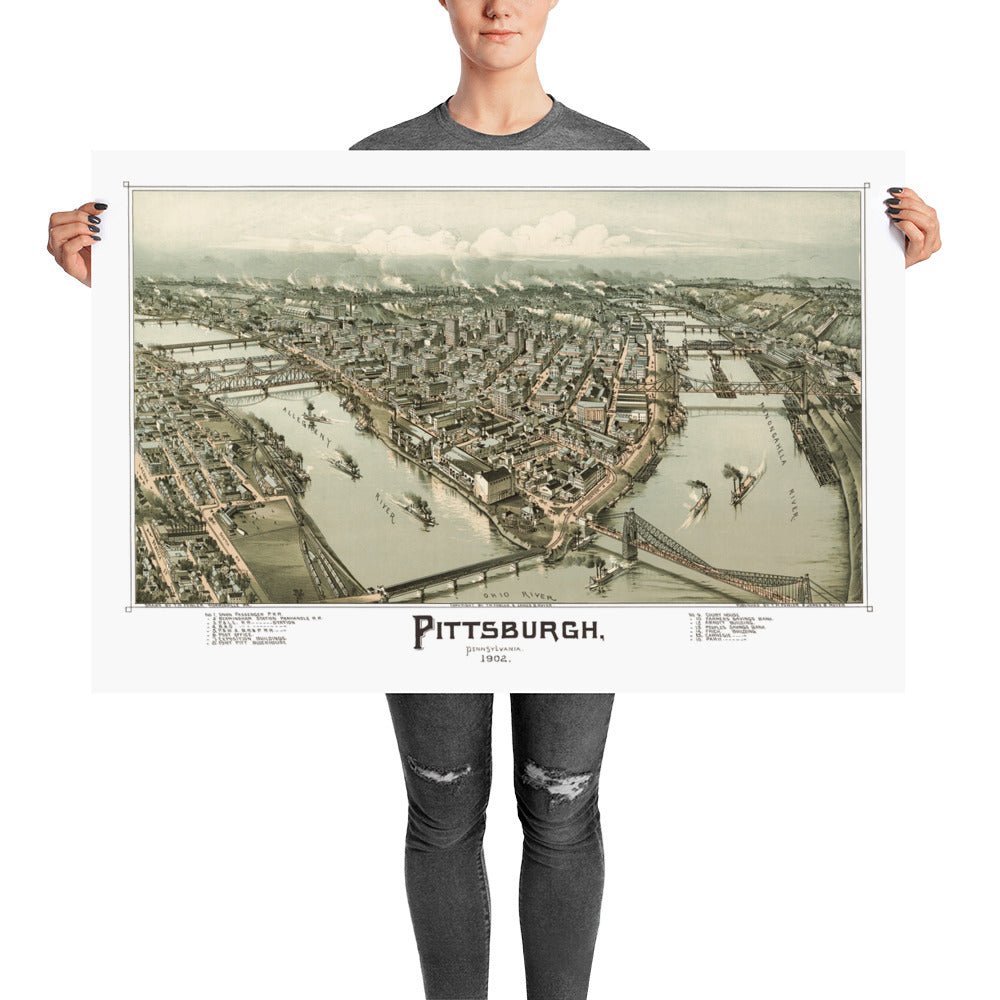 A statement in any room, each reproduction is printed on museum quality, archival paper using a restored version of the original map of Pittsburgh, PA from 1902.