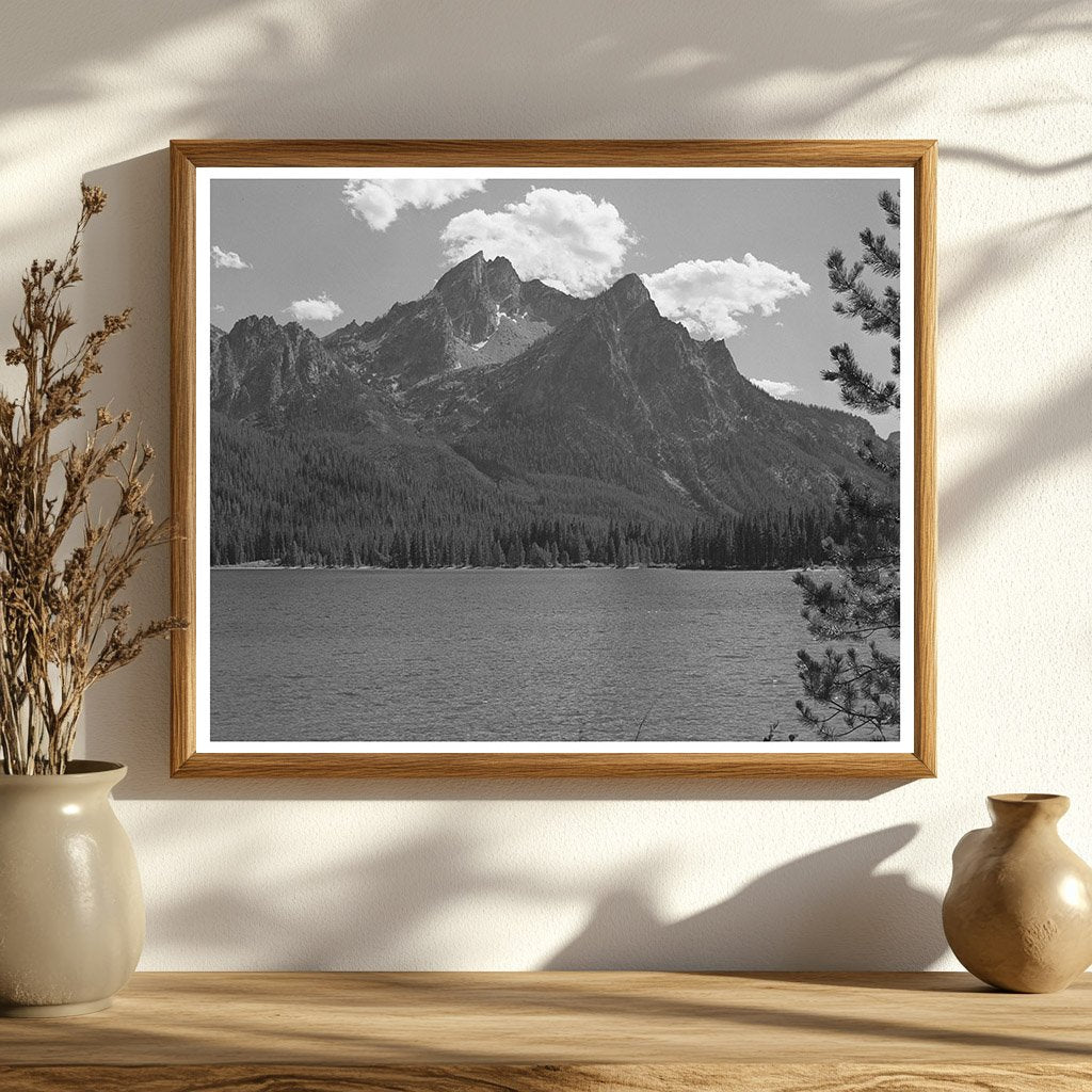 This vintage photograph captures a serene landscape of Stanley Lake in Custer County, Idaho. Taken in August 1942, it belongs to the FSA/OWI Collection. The image provides insight into Idahos natural beauty and historical context during the early 1940s, reflecting the regions tranquility and charm.