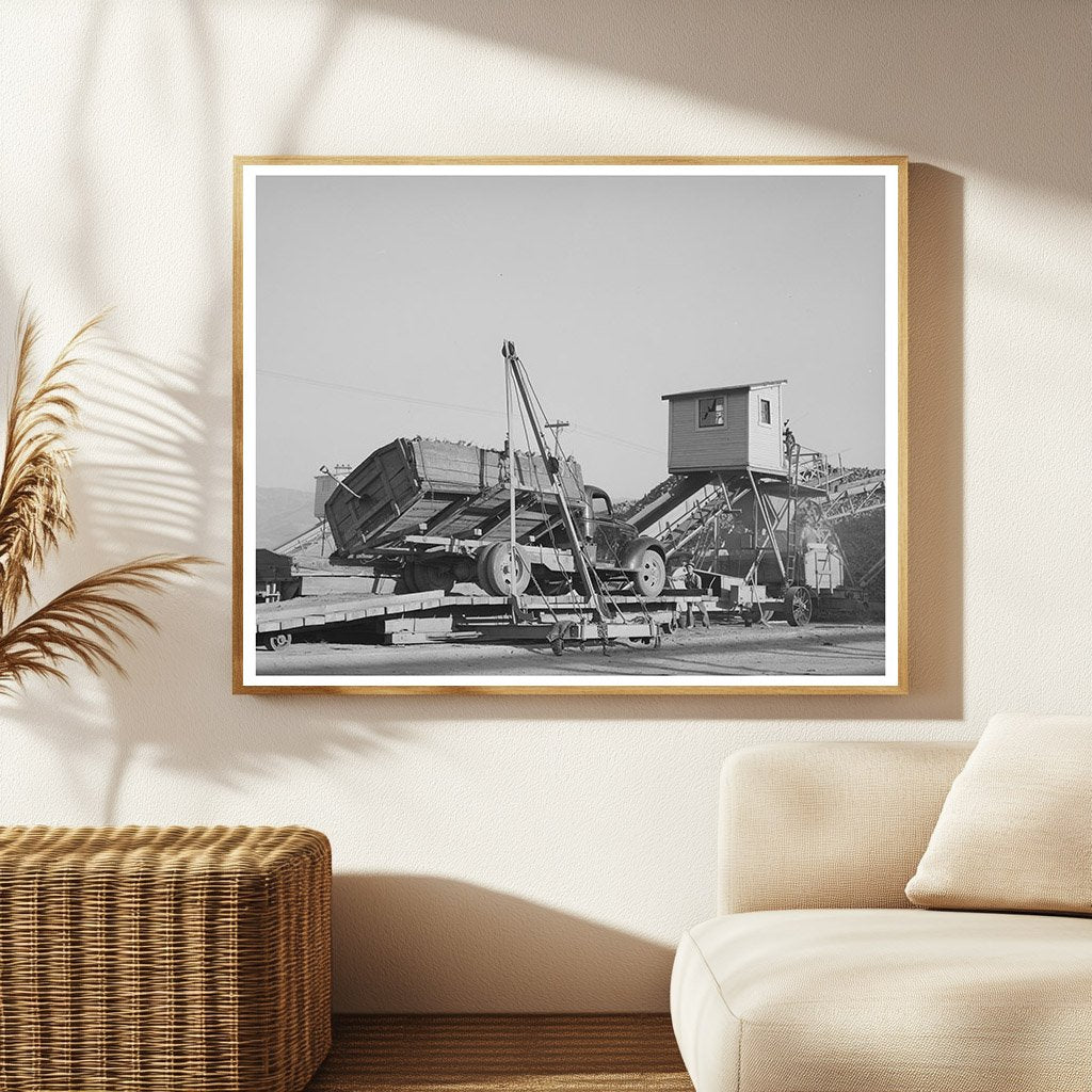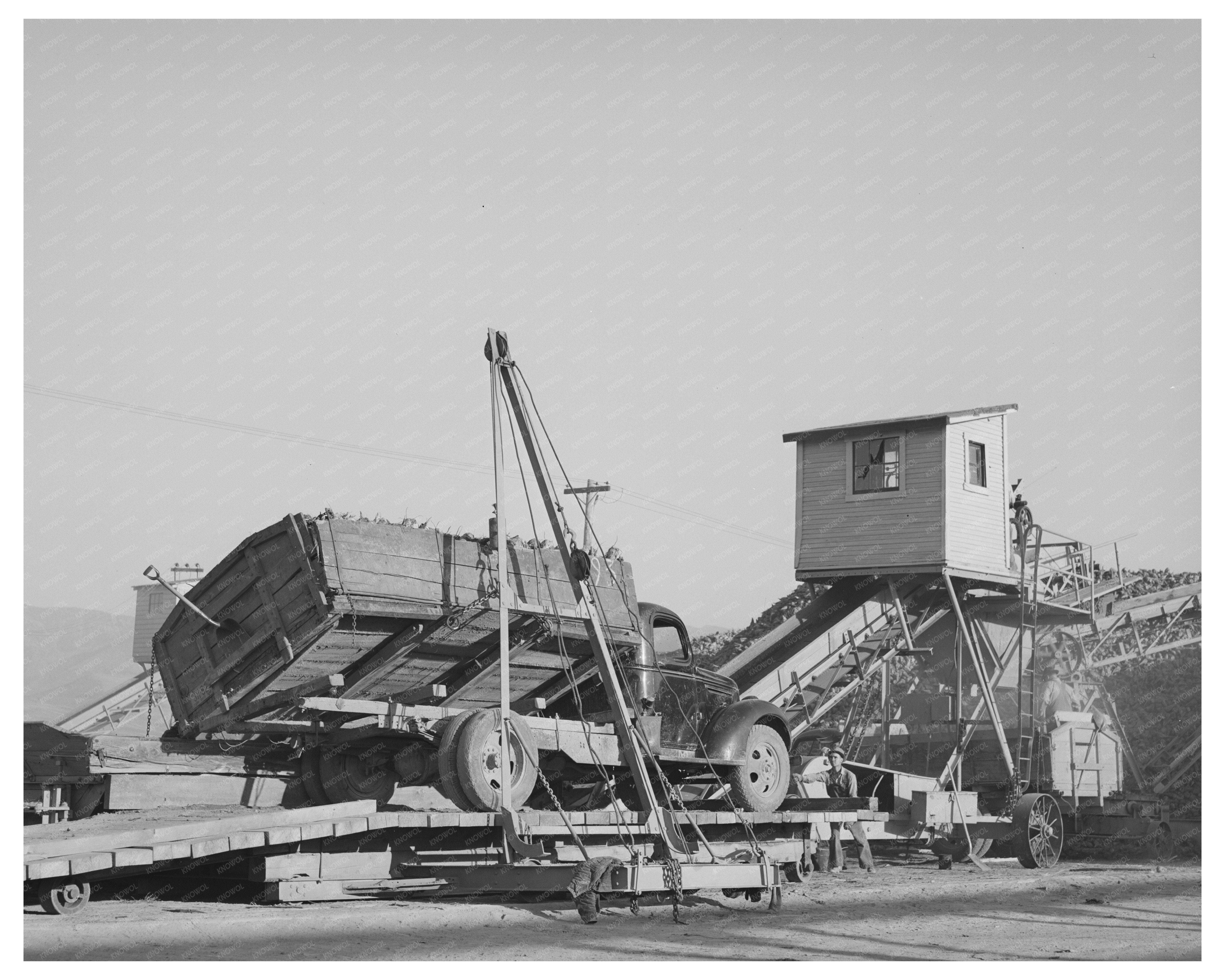 A truck unloads sugar beets at a processing plant in Lewiston, Utah. Captured in November 1940, this image showcases agricultural operations in Cache County. At this time, sugar beet farming played a significant role in the local economy, contributing to both agriculture and industry in the region.