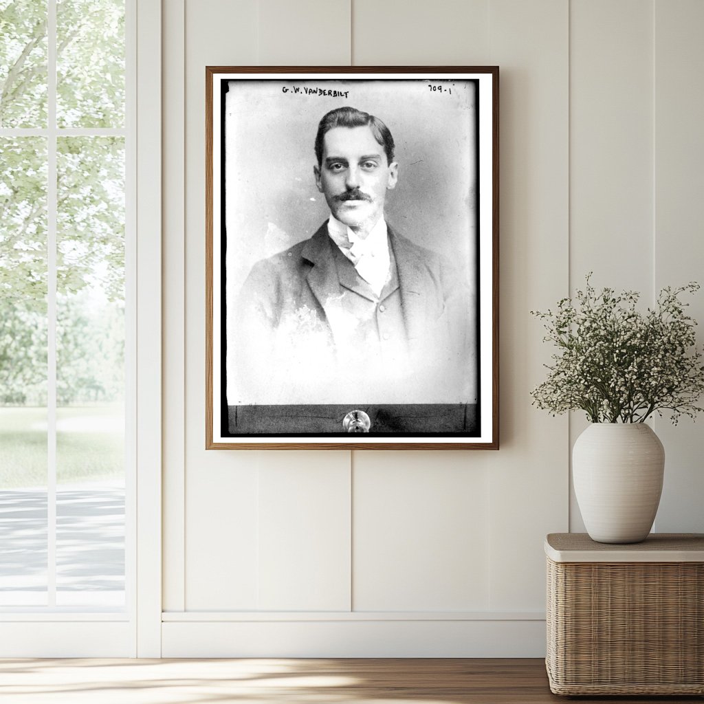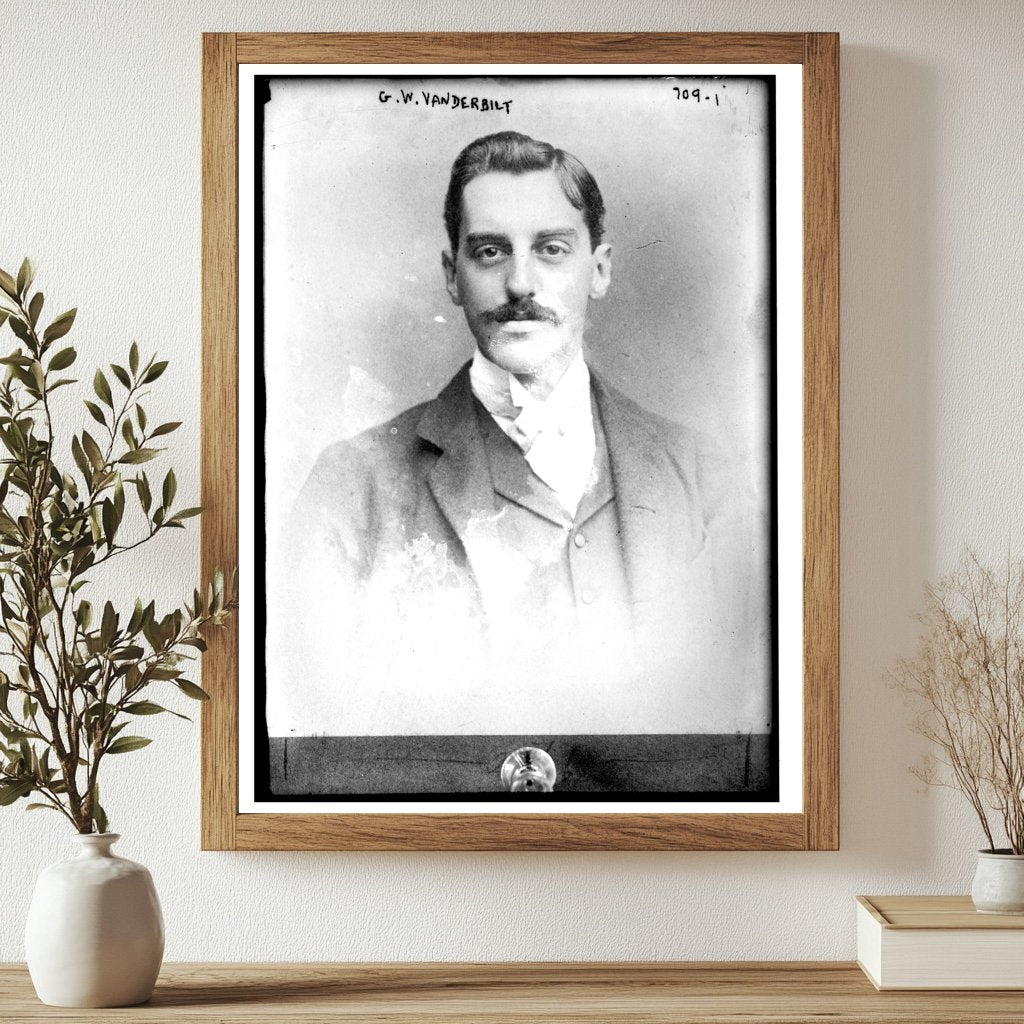 This image features George Washington Vanderbilt II, a prominent American businessman known for his role in the development of the Biltmore Estate in Asheville, North Carolina. Born in 1862, he was the youngest son of the prominent Vanderbilt family, which had made its fortune in the railroad industry. G.W. Vanderbilts vision and ambition led him to establish one of the largest privately-owned homes in the United States, completed in 1895. The estate exemplifies the Gilded Ages architectural grandeur and reflects Vanderbilt’s love of art and nature.