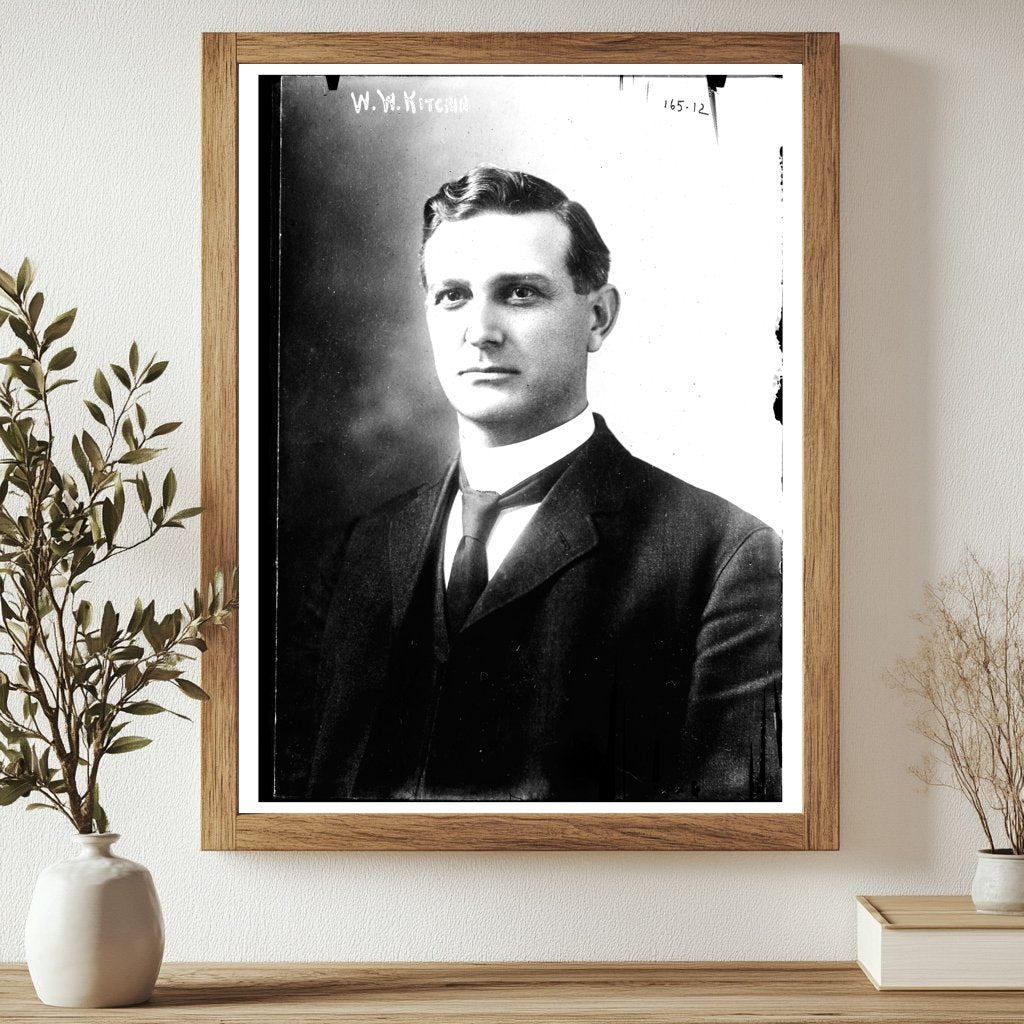 This historical photograph features a bust portrait of W.W. Kitchin, a notable political figure from North Carolina. Born in 1861, Kitchin served as a United States Congressman from 1901 to 1913, representing the states 5th congressional district. His influence in the early 20th century was marked by his commitment to issues such as agricultural development and economic reform, reflecting the challenges and aspirations of the American South during post-Civil War recovery.