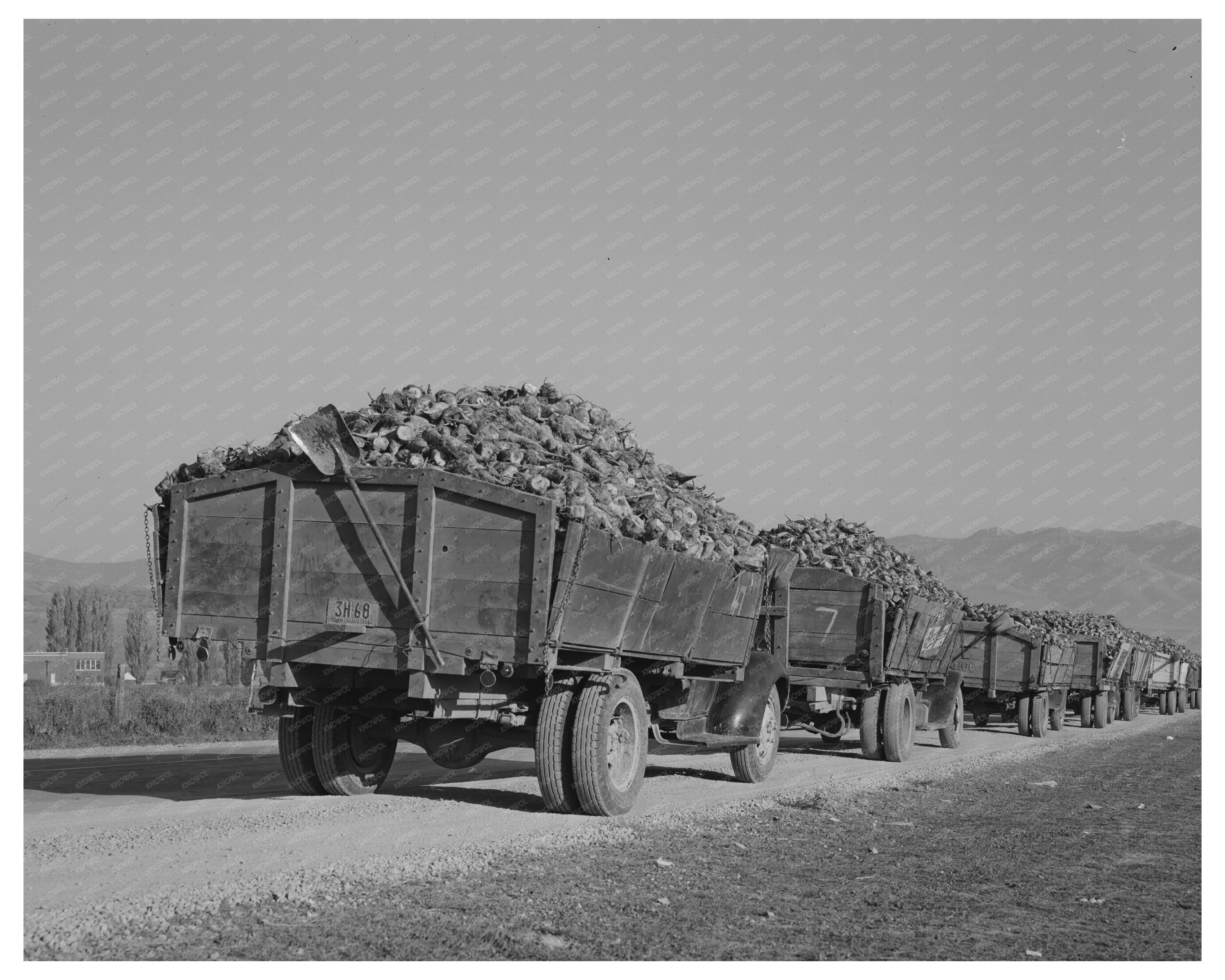 Trucks with Sugar Beets at Processing Plant Lewiston 1940