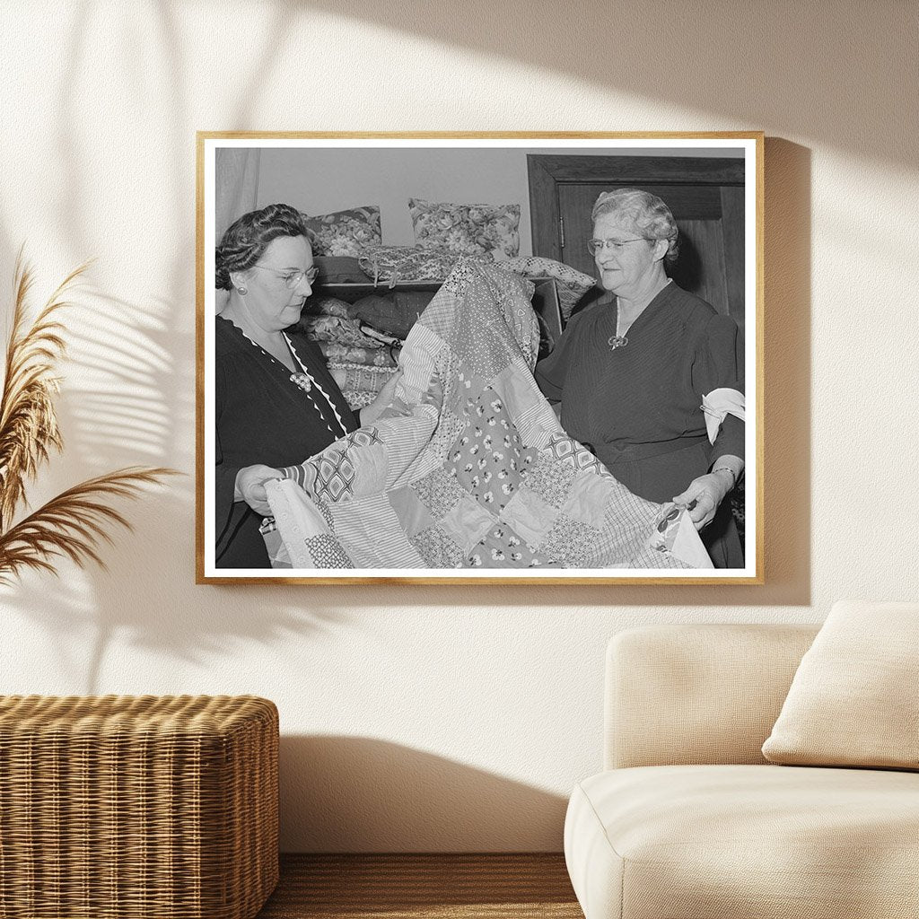 A housewife in Turlock California stands beside quilts made by the Parent Teacher Association for the Red Cross. Captured in May 1942 this image reflects community support during World War II. The woman in the photograph served as the PTA president demonstrating local involvement in wartime initiatives and charitable efforts.