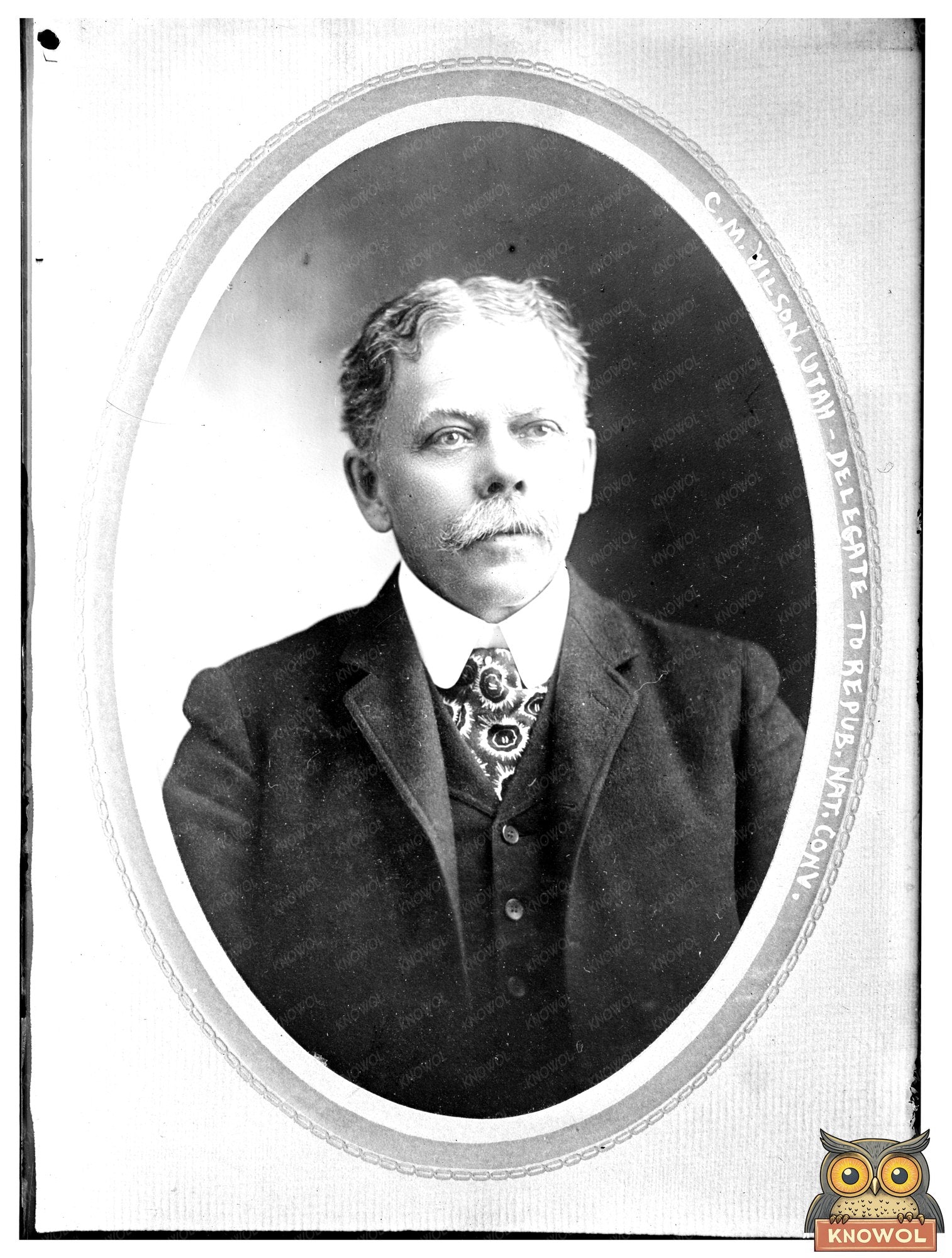 This photograph is a cameo portrait of C.M. Wilson, a significant political figure from Utah. Wilson served as a delegate to the Republican National Convention, a role that underscores the increasing involvement of Western states in national political processes during the early 20th century. The Republican National Convention was crucial for shaping the party’s platform and nominating candidates for presidential elections, reflecting the political landscape of the era.