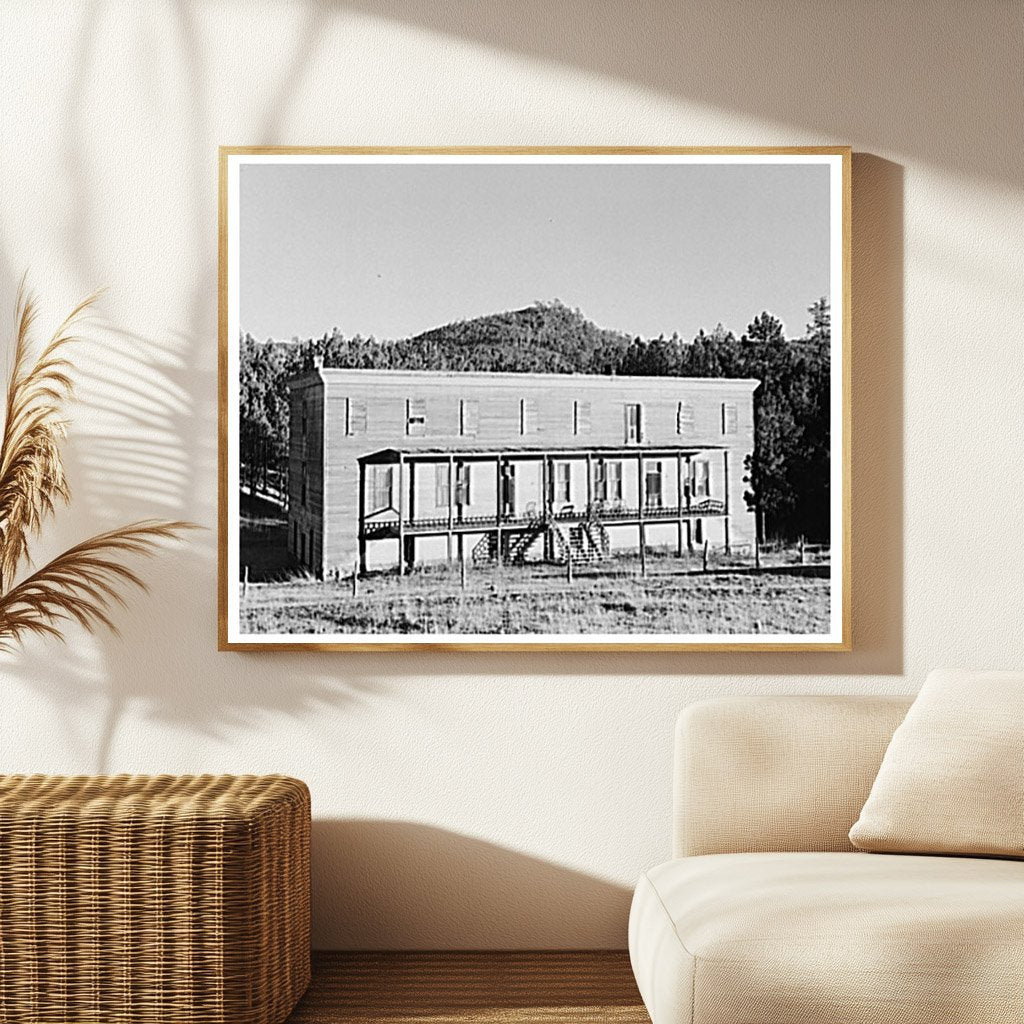 This vintage photograph showcases a hotel and boarding house for single men in Two Bit, near Deadwood, South Dakota. Taken in November 1937, it illustrates the lifestyle and culture of gold mining towns during that era. This image is part of the FSA/OWI Collection, preserving a unique moment in American history.